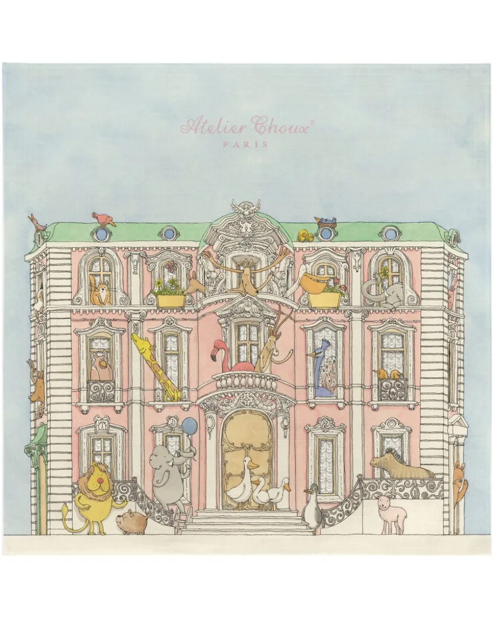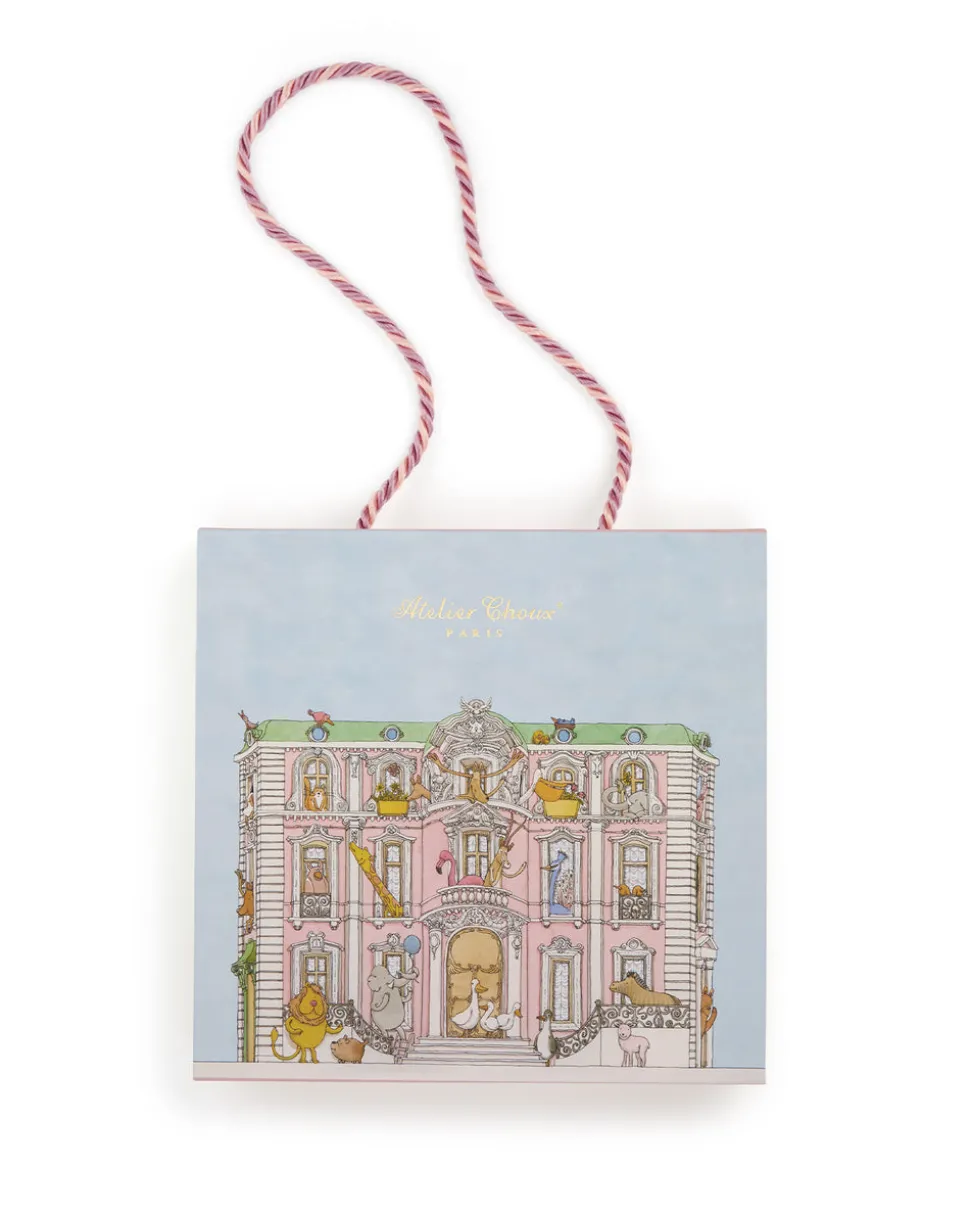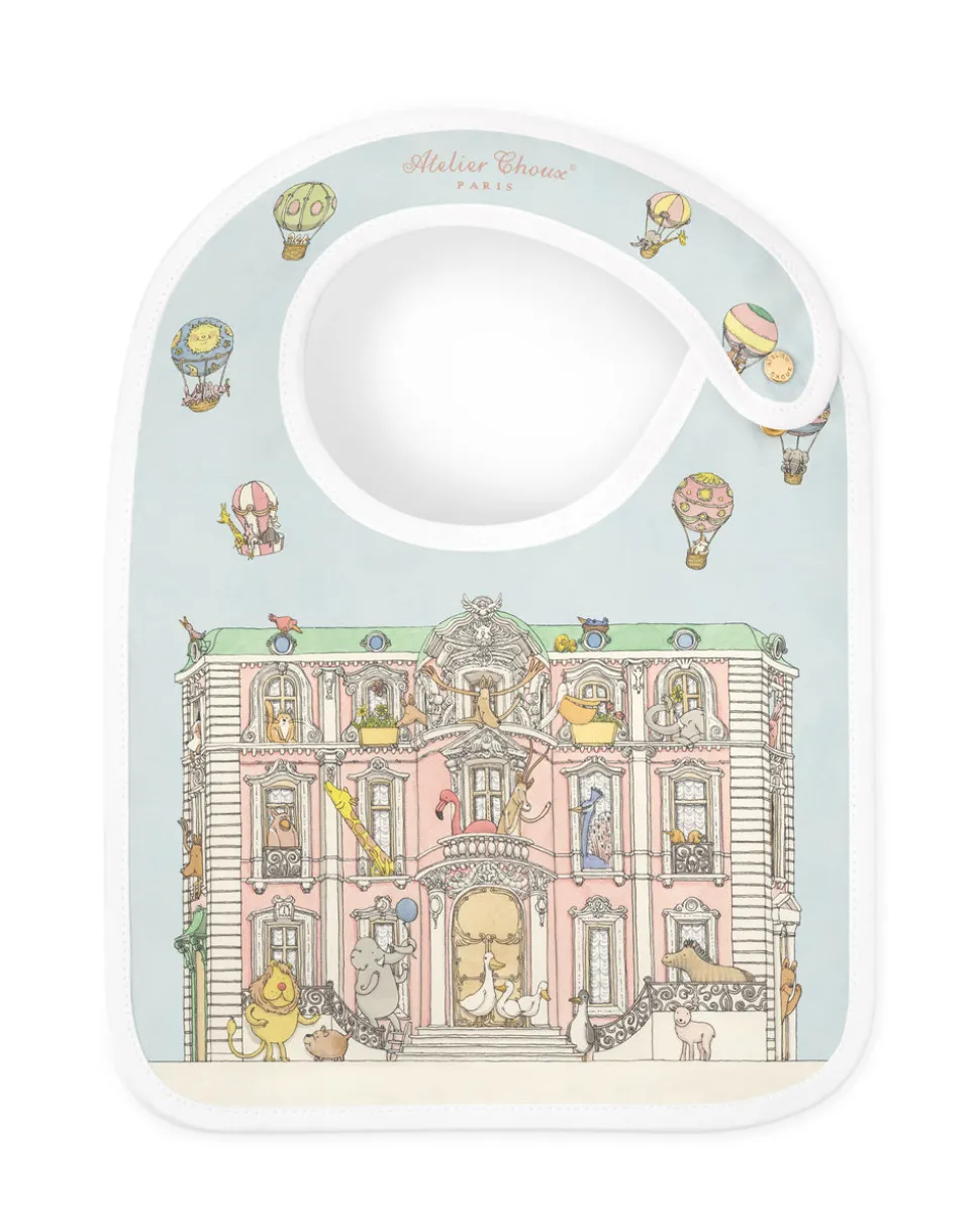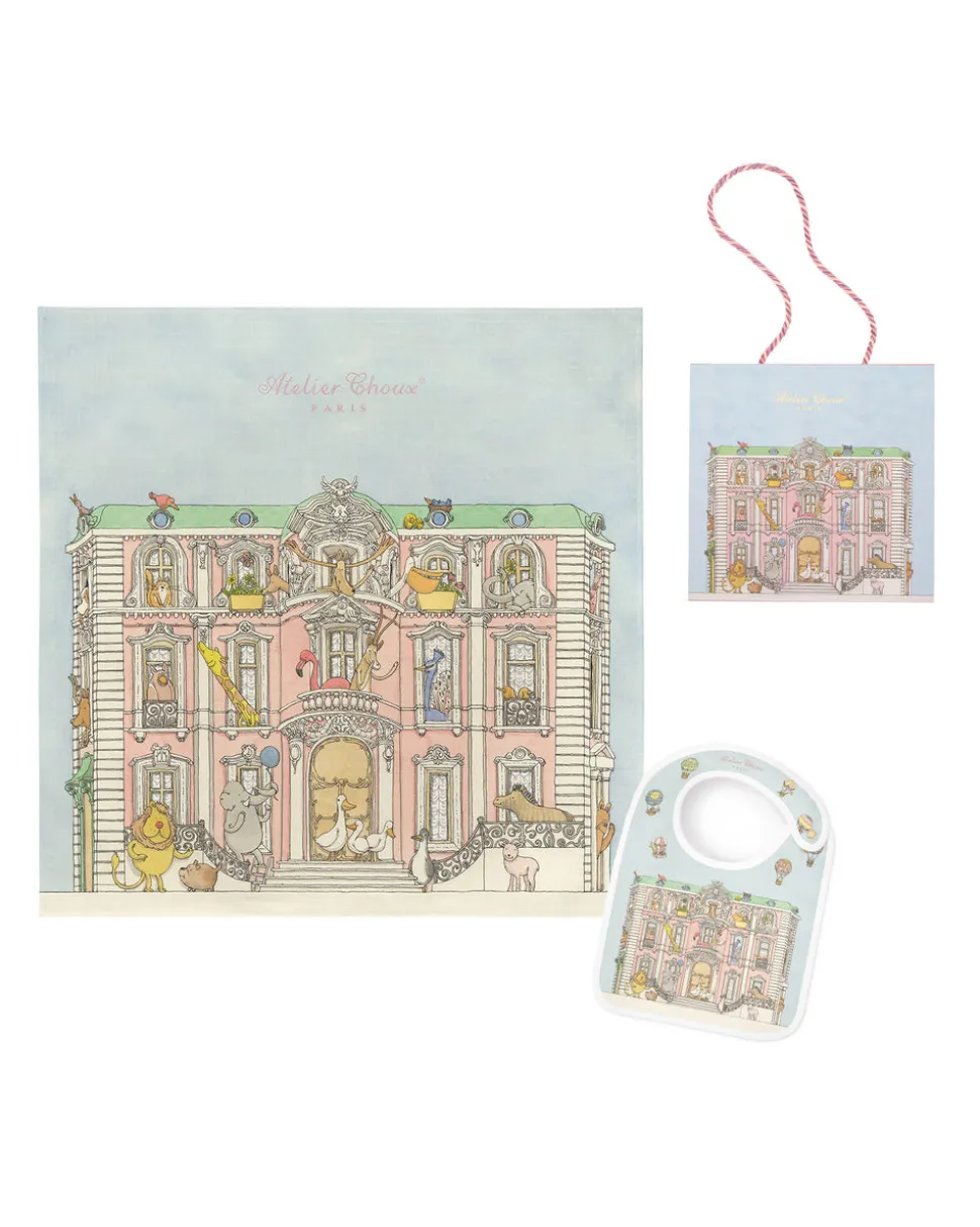 A new French maison for millennial families, Atelier Choux is a lifestyle brand that focuses on interior design in its bedding, textile accessories, wall décor, clothing, and collectible gift boxes. Inspired by Troisième Empire Parisian architecture, each item balances tongue-in-cheek humor with sophistication, revealed in recurring themes like elaborate buildings, simple charismatic animals, fanciful crests, and hot air balloons. The Carre & Satin Bib Set in Monceau Mansion is the ultimate Parisian baby gift. This gift set includes an Atelier Choux carré (light blanket)—ideal as a chic stroller accessory, photo background, or tablecloth during playtime or mealtime—with a matching bib, for babies 0 – 3 years. Each set comes in Atelier Choux’s signature gift box, with a magnetic closure and a silk carrying cord.
