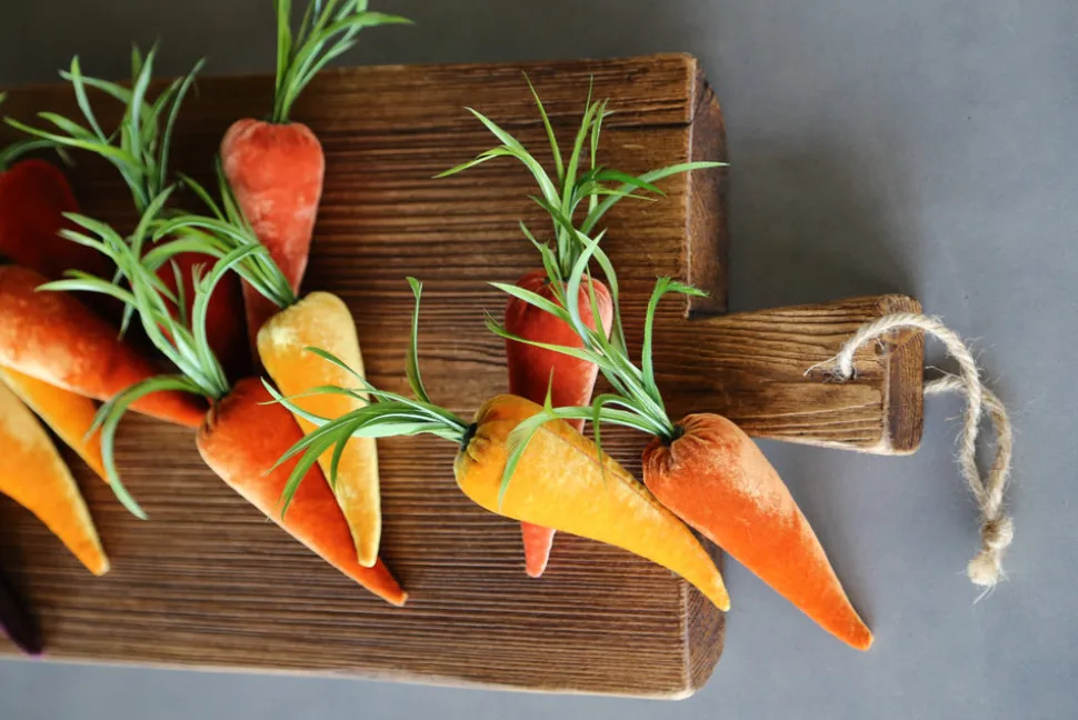 What started as a craft side business by founder Daria Knowles has blossomed into a downright covetable collection of meticulously handcrafted decor pieces made by a team of trained artisans that showcase a touch of nature’s beauty and charm. Enhance your spring tablescapes and festive moments with this chic silk velvet carrot in a classic Carrot Orange, cut and sewn to order, finished with a spectacularly cut and curled naturally dyed green feather plume.