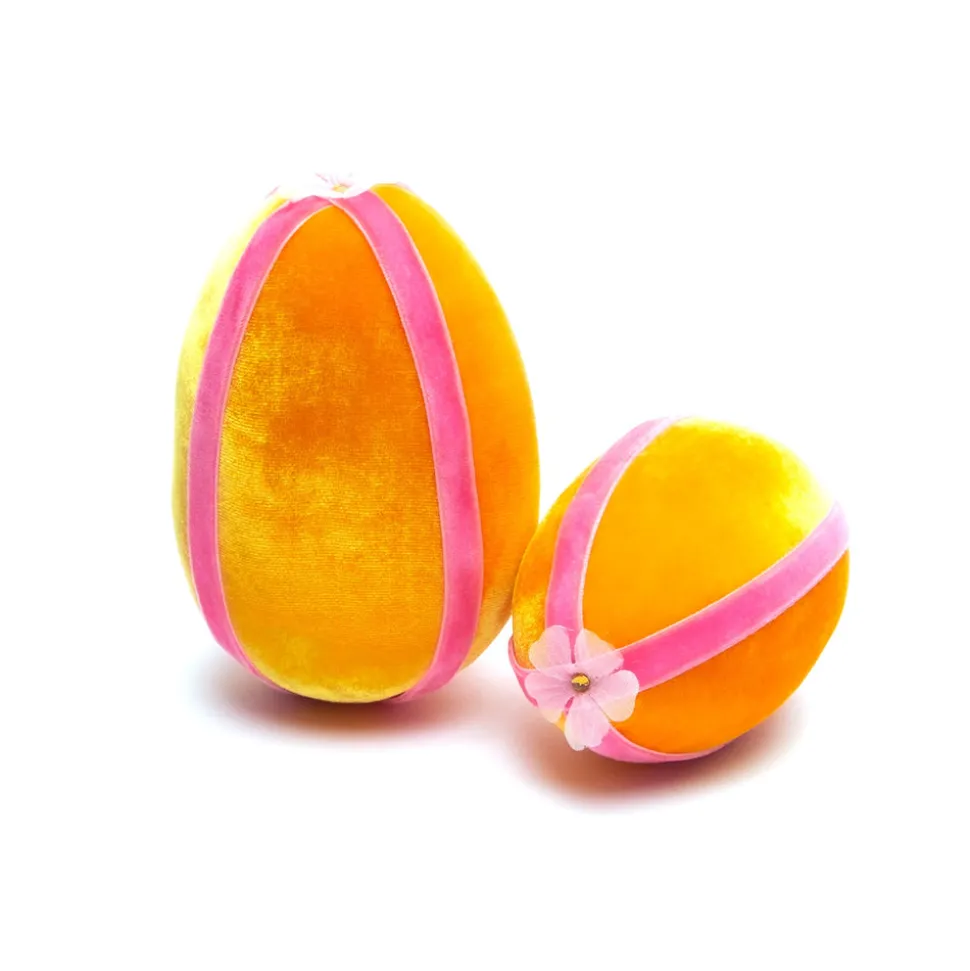 What started as a craft side business by founder Daria Knowles has blossomed into a downright covetable collection of meticulously handcrafted decor pieces made by a team of trained artisans that showcase a touch of nature’s beauty and charm. Enhance your spring tablescapes and festive moments with this 9-piece bushel of carrots in a colorful assortment, cut and sewn to order, finished with rich silk velvet egg in a stunning shade of classic Carrot Orange with a contrasting Pink velvet ribbon, available in 2 sizes for your decorating pleasure.