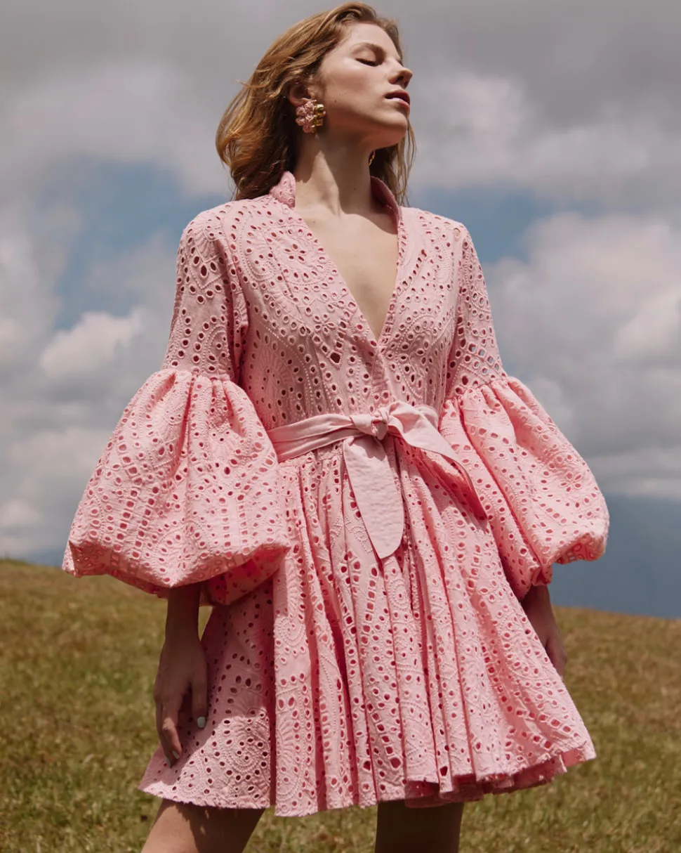 Founded by Daniela Panaro, No Pise La Grama, which translates to “don’t step on the grass,” is a Venezuelan fashion brand known for its feminine, timeless designs. As the name suggests, there’s a strong connection to nature through the elevated yet laid-back aesthetic inspired by travel and the art of traditional craftsmanship. The Carta Y Letra Dress in Pink Eyelet reimagines the classic shirt dress in a playful mini length, crafted in airy cotton with delicate eyelet embroidery. Both charming and refined, it’s a versatile piece for sunlit strolls and twilight dinners alike.