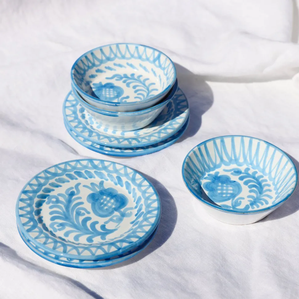 Using ancient techniques and Lebrillo motifs that date back to the 16th century, each Pomelo Casa piece is handmade and hand-painted by only five small, family-run workshops in Granada. For the first time, they are being exported outside of Europe, so that the gorgeous, simple, timeless patterns of Southern Spain can be shared with the world, making it brighter in the process. The Casa Celeste Mini Plate with Hand-Painted Designs features pastoral figures—birds and pomegranates—and a delightful trim, in calming sky blue. Because of their handmade nature, each piece may have a slight variation in pattern as a result. Minor imperfections are not considered flaws but instead add to the authenticity and charm of these beautiful home goods.