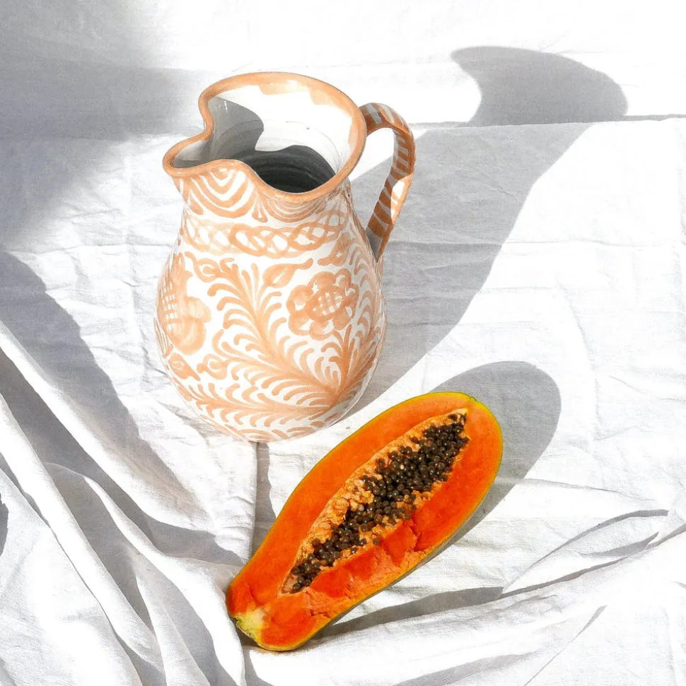 Hand-painted with a traditional Spanish design featuring birds and flowers, the Casa Melocoton Large Pitcher is subtly striking and well-suited for dining or table decoration. Each Pomelo Casa piece is handmade in Southern Spain by ceramicists who have been using the same techniques for over five centuries and may have a slight variation in pattern as a result. Minor imperfections are not considered flaws but instead add to the authenticity and charm of these beautiful home goods.