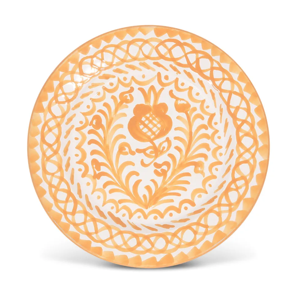 Using ancient techniques and Lebrillo motifs that date back to the 16th century, each Pomelo Casa piece is handmade and hand-painted by only five small, family-run workshops in Granada. For the first time, they are being exported outside of Europe, so that the gorgeous, simple, timeless patterns of Southern Spain can be shared with the world, making it brighter in the process. The Casa Melocoton Salad Plate with Traditional Designs features pastoral designs—birds and pomegranates—as well as a delightful pattern in earthy orange. Because of their handmade nature, each piece may have a slight variation in pattern as a result. Minor imperfections are not considered flaws but instead add to the authenticity and charm of these beautiful home goods.