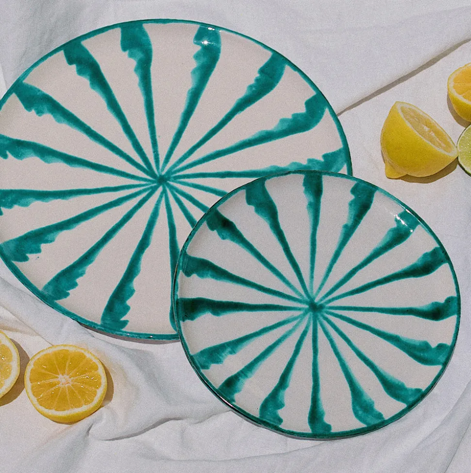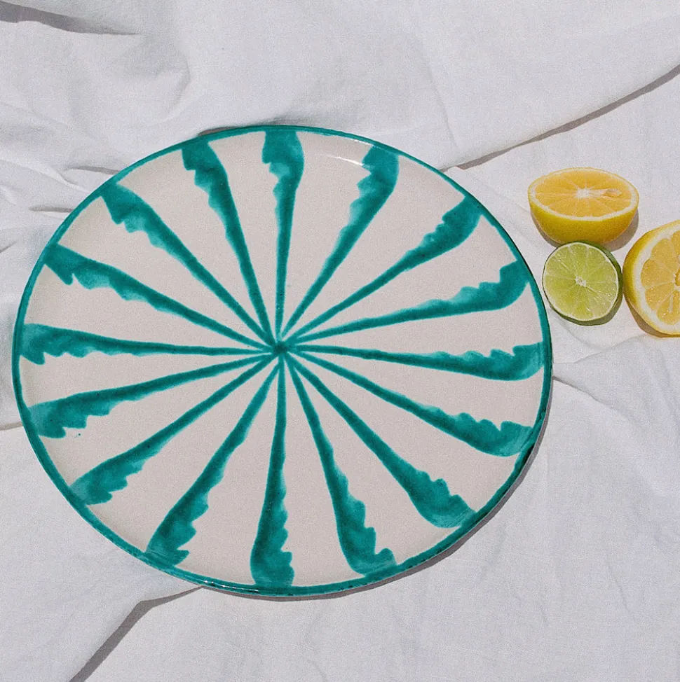 Hand-painted with candy cane stripes, the Casa Verde Dinner Plate is subtly striking and well-suited for dining, table decoration, or as wall decor. (There are two holes on the back that make for easy hanging.) Each Pomelo Casa piece is handmade in Southern Spain by ceramicists who have been using the same techniques for over five centuries and may have a slight variation in pattern as a result. Minor imperfections are not considered flaws but instead add to the authenticity and charm of these beautiful home goods.