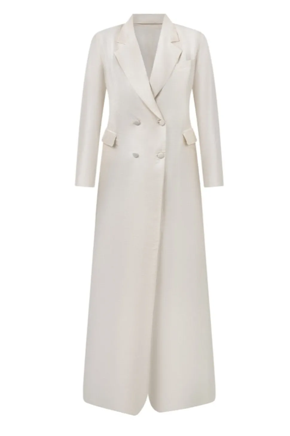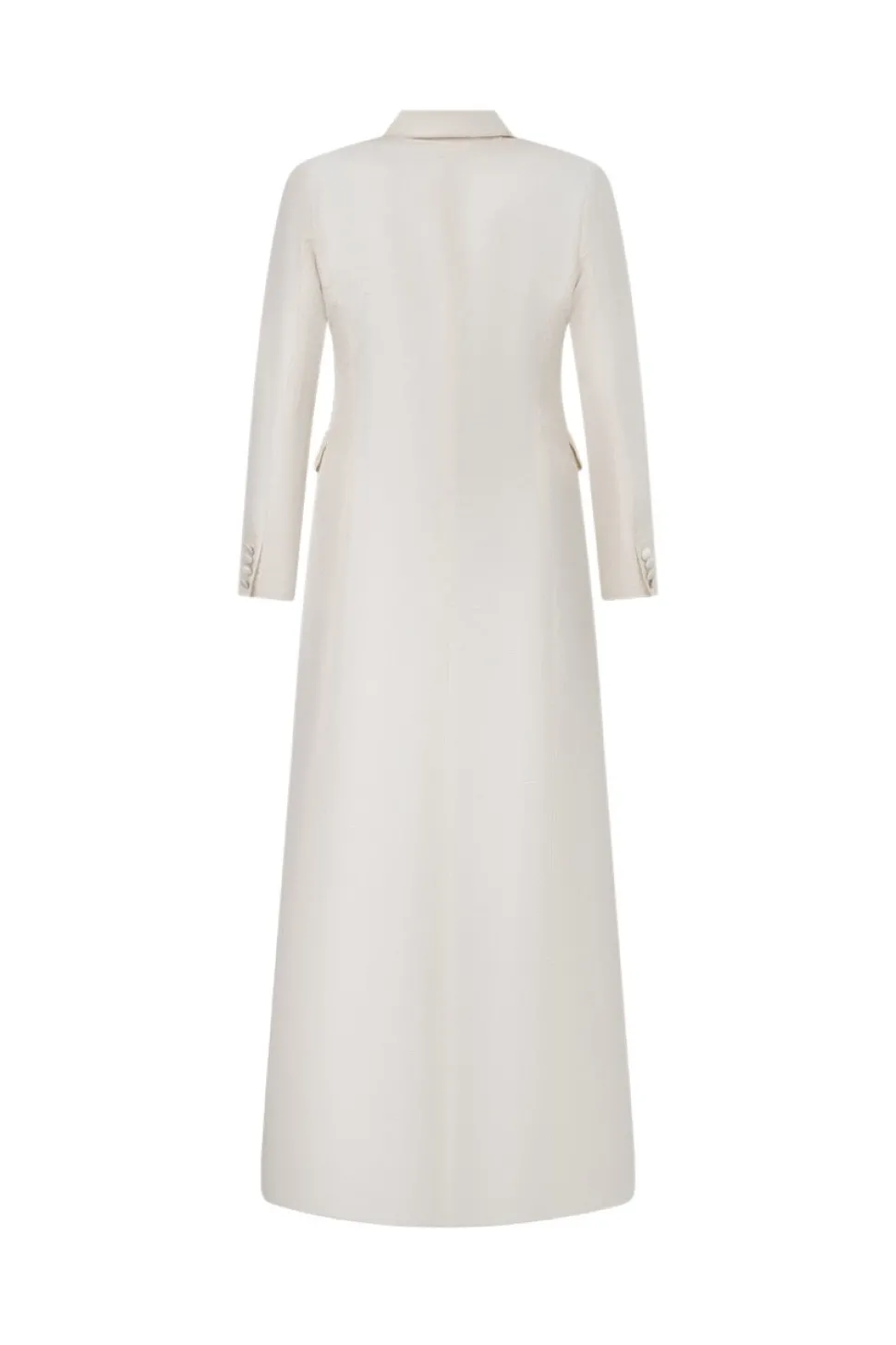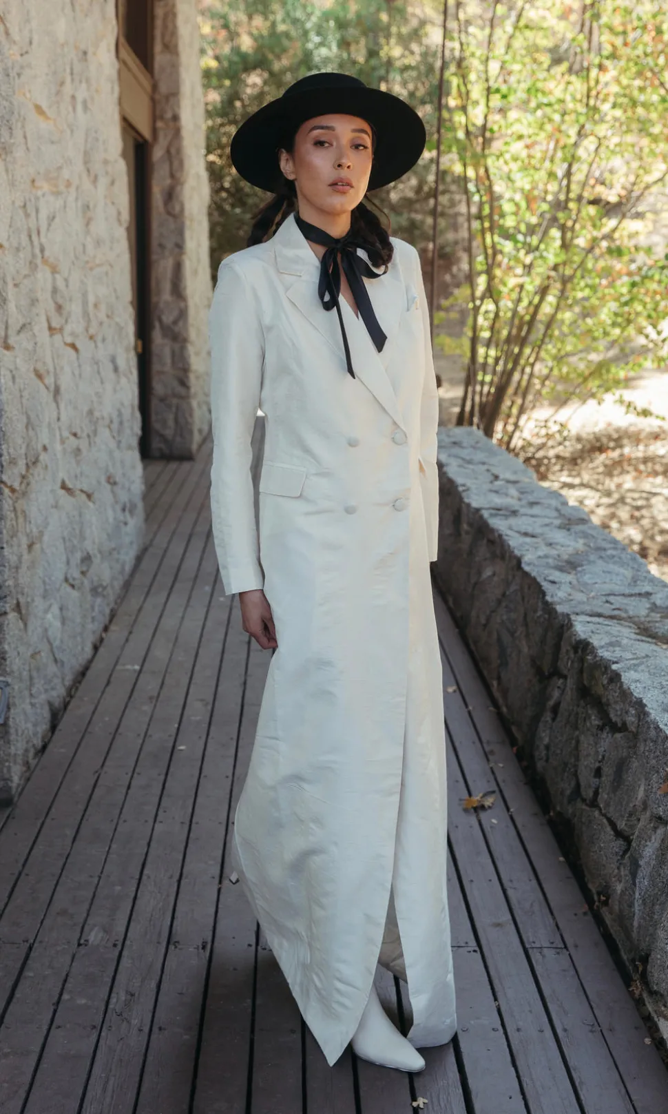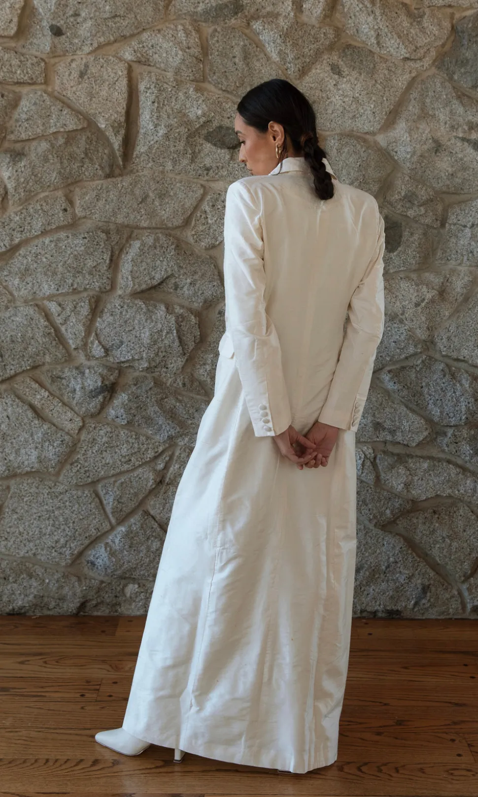 Nestled in California’s San Joaquin Valley, Daughters of Simone draws inspiration from American themes and culture, specializing in bridal wear and suits. The silhouettes evoke a blend of Victorian and Western influences, infused with the free-spirited essence of the 1970s. The Cass Silk Bridal Tuxedo Gown boasts tafita silk, a slight train, and is covered in silk buttons.