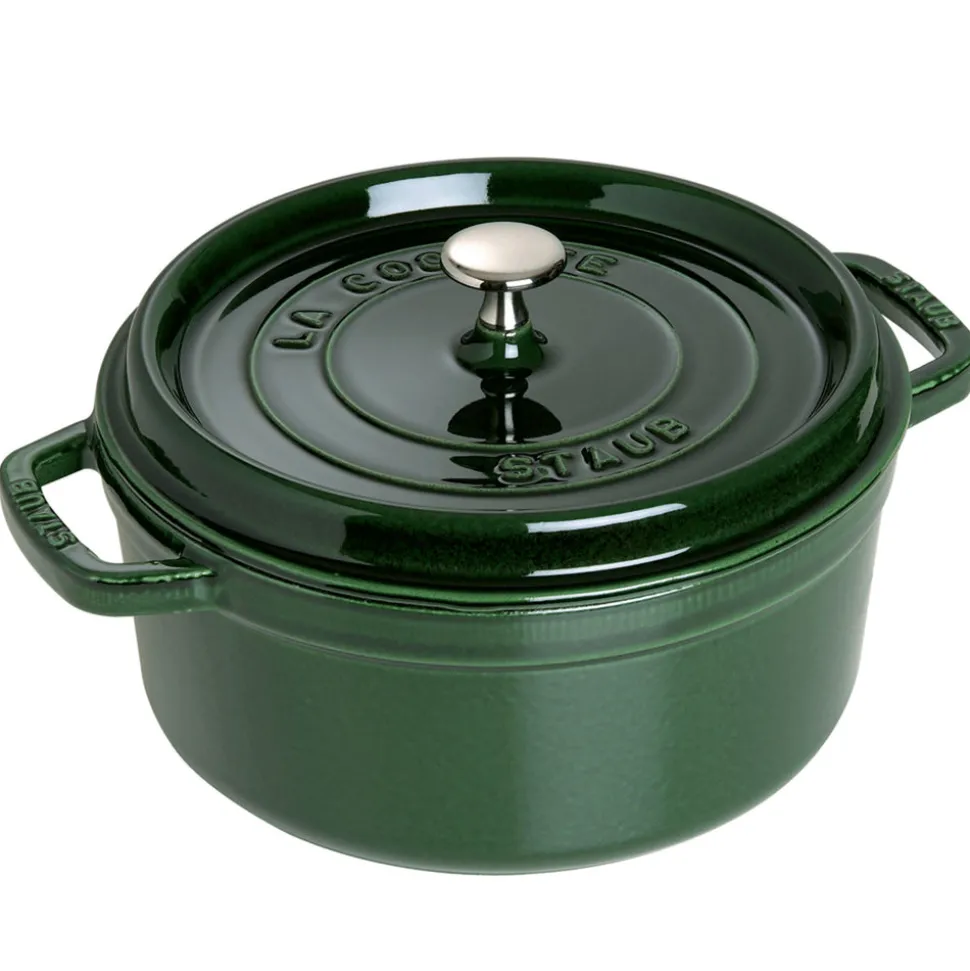 Rooted in French culinary heritage, Staub is beloved by professional and home chefs for its exquisite craftsmanship, exceptional performance, and timeless beauty. The Cast Iron 5.5-qt Round Cocotte in Basil is unsurpassed for slow-cooking large batches of meat and vegetables to tender perfection, and for simmering hearty stews and soups. The gorgeous Majolique enameling finish is a special, three-step technique that imbues the basil color with brilliance and depth. Cast iron possesses exceptional heat-retaining qualities, so the pot heats evenly throughout. With a heavy weight, tight-fitting lid that retains moisture and tiny spikes on the lid interior that create a rain-forest effect evenly returning juices back onto food, you can expect moist, wonderfully cooked food every time you use this pan.