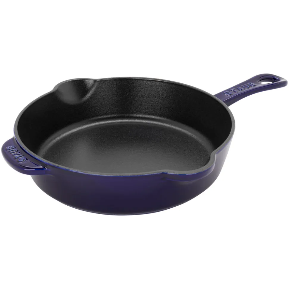 Proudly made in France, Staub has been the benchmark for premium cast iron cookware. Like all Staub fry pans, the Staub Traditional Skillet browns foods beautifully. Whether youÕre searing chicken breasts, frying bacon, or caramelizing carrots, the Staub enameled black matte interior imparts texture, promoting exceptional browning and searing, without sticking. And because cast iron offers steady, even heat distribution, the temperature of the pan won’t drop as you cook. Like a sautŽ pan and fry pan in one, our Traditional Skillet boasts all the features of a fry pan combined with higher, straighter sides, which means less splatter on the stovetop. Staub enameled cast iron cookware is the choice of the world’s best chefs. With exceptional durability, itÕs perfect for day-to-day use in both gourmet home kitchens and prestigious restaurants around the world. Each piece transitions beautifully from the kitchen to the table. Built to last a lifetime, these heirloom pieces can be passed from generation to generation.