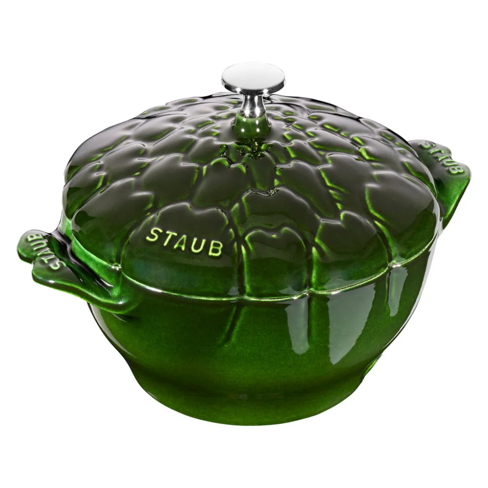 Rooted in French culinary heritage, Staub cookware is beloved by professional and home chefs for its exquisite craftsmanship, exceptional performance, and timeless beauty. The Cast Iron Artichoke Cocotte features another farmer’s market favorite, this time in gorgeous basil. Textured black matte enamel interior ensures exceptional browning. Enameled cast iron is easy to clean and doesn’t require seasoning. Durable cast iron construction boasts incredible heat retention and distribution. Vivid three-step Majolica enameling imbues color with brilliance and depth. As is the tradition in French families, these heirloom pieces can be lovingly passed from generation to generation.