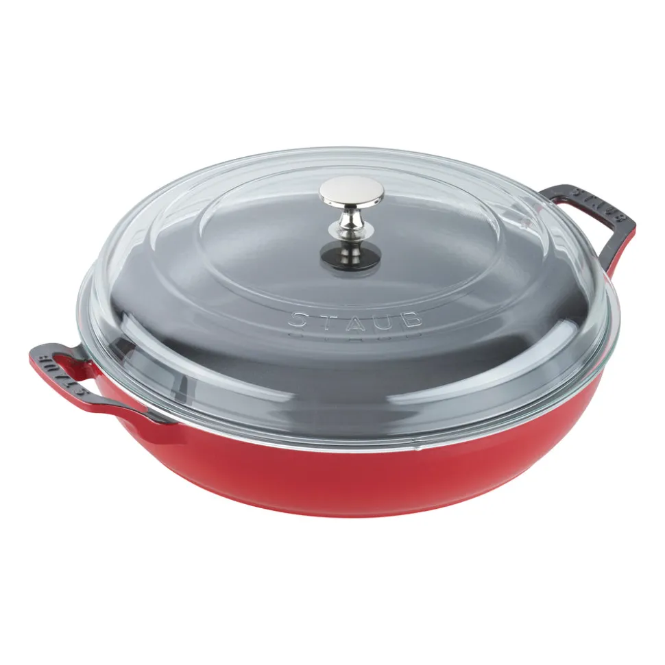 This cherry red 3.5-quart braiser is the perfect pot for one-dish dinners, slow cooked braises, and simmered soups. The heavyweight, domed glass lid locks in moisture and accommodates large cuts of meat. Cast iron possesses exceptional heat-retaining qualities, so the pan heats evenly throughout. The tight-fitting glass lid retains moisture, so you can expect moist flavorful results and you can conveniently monitor cooking without removing the lid. This unique design features vintage-looking handles that encourage easy maneuvering while wearing oven mitts.Rooted in French culinary heritage, STAUB cookware is beloved by professional and home chefs for its exquisite craftsmanship, exceptional performance, and timeless beauty. Each piece of STAUB cookware effortlessly and elegantly transitions from the oven to the table – you can cook and serve in the same dish. These heirloom pieces can be lovingly passed from generation to generation.