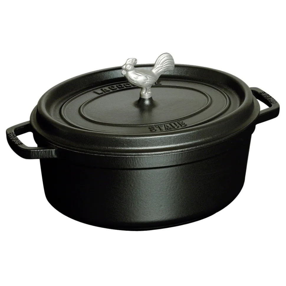 Rooted in French culinary heritage, Staub is beloved by professional and home chefs for its exquisite craftsmanship, exceptional performance, and timeless beauty. The Cast Iron 5.75-qt Coq au Vin Cocotte in Matte Black is unsurpassed for slow-cooking meats and vegetables to tender perfection, and for simmering hearty stews and soups. Cast iron possesses exceptional heat-retaining qualities, so the pot heats evenly throughout. The innovative lid features tiny spikes on the interior that continually release condensed liquid back onto the food, yielding moist, flavorful results. The special matte black enamel interior and self-basting spiked lid guarantee ideal browning and braising for flavor-enhanced food. With their exquisite enamel finish, each piece transitions beautifully from the kitchen to the table.