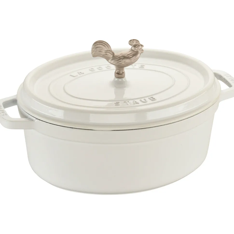 Rooted in French culinary heritage, Staub is beloved by professional and home chefs for its exquisite craftsmanship, exceptional performance, and timeless beauty. The Cast Iron 5.75-qt Coq au Vin Cocotte in White is unsurpassed for slow-cooking meats and vegetables to tender perfection, and for simmering hearty stews and soups. Cast iron possesses exceptional heat-retaining qualities, so the pot heats evenly throughout. The innovative lid features tiny spikes on the interior that continually release condensed liquid back onto the food, yielding moist, flavorful results. The special matte black enamel interior and self-basting spiked lid guarantee ideal browning and braising for flavor-enhanced food. With their exquisite enamel finish, each piece transitions beautifully from the kitchen to the table.