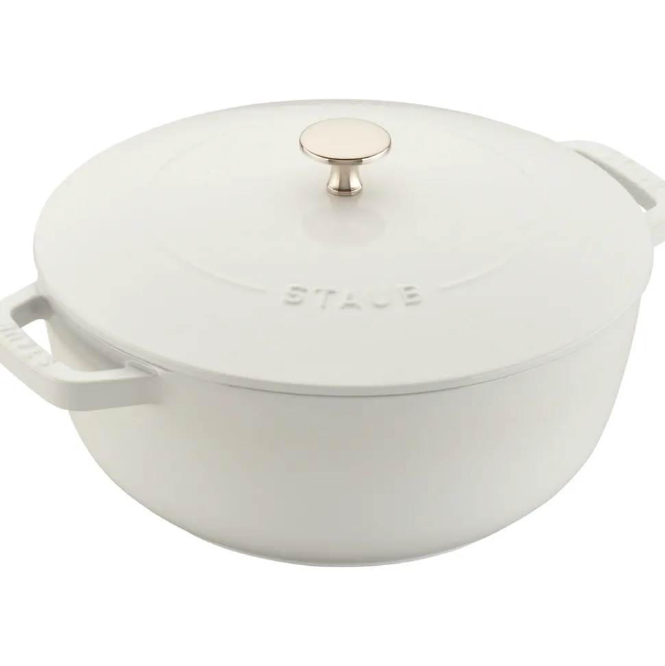 Staub enameled cast iron cookware is the top choice for chefs and home cooks alike. Rooted in French culinary heritage, Staub’s renowned cocottes are timeless pieces, perfect for casual meals or sumptuous suppers. The Essential French Oven with Chistera lid is the latest star in the cast iron collection. Like Staub’s signature flat lid, the domed Chistera lid has excellent self-basting properties. Usually, a convex lid causes condensation to fall to the sides. The innovative, Chistera drop-structure lid solves this problem by putting a twist on traditional spikes. Moisture cascades from the whole lid. This continuous basting guarantees delectable roast chicken and braised short ribs.