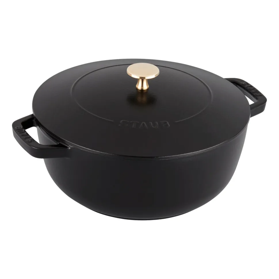 Exceptional heat distribution and retention cast iron is famous for. Matte black enamel interior heats and enhances caramelization, excellent searing. Versatile design goes from oven to table. Enameled cast iron is easy to clean and doesn’t require seasoning. Iconic Staub handles with ergonomic grip. Made in France.
