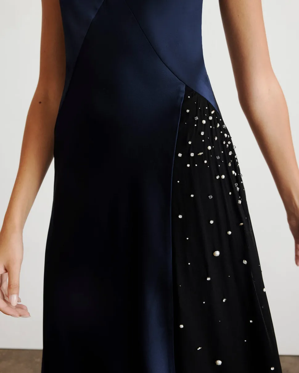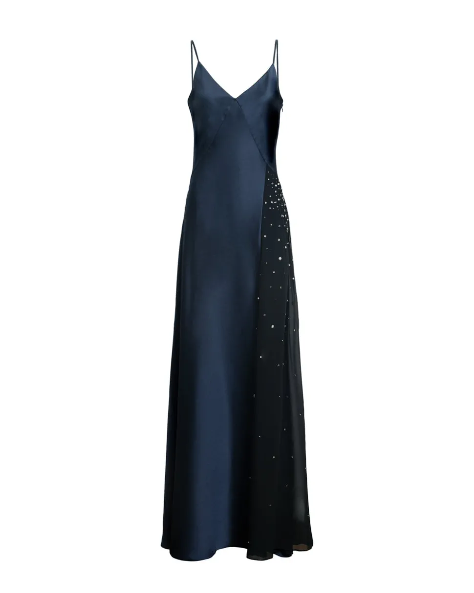 Satin crepe. V-neckline. Bias-cut silhouette. Poly chiffon side skirt cutout with crystal embellishment. Sleeveless. Concealed side zip closure. Midi length. Unlined.