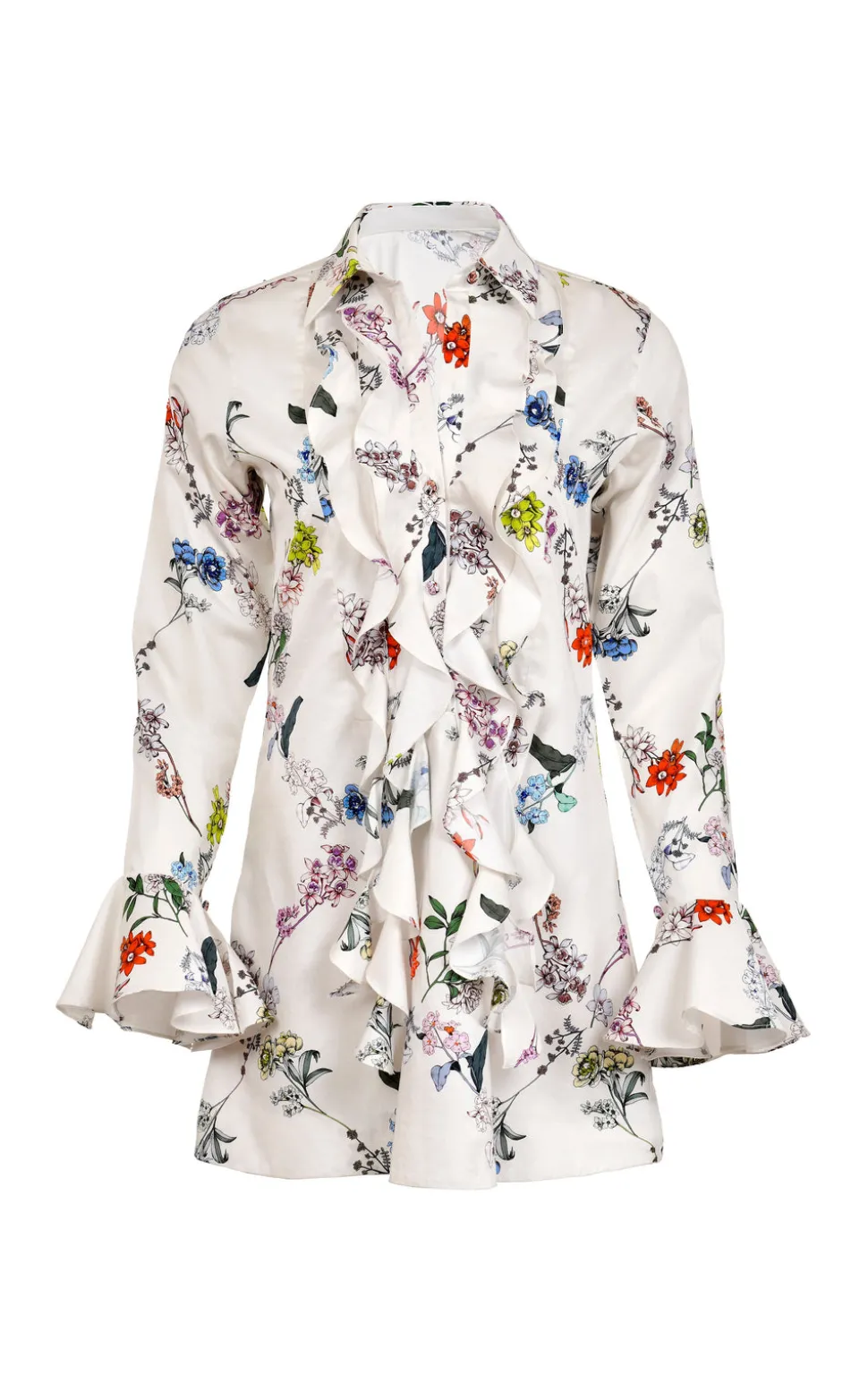 From her atelier in Barranquilla, Colombia, Francesca Miranda combines the diverse, indigenous aesthetic of her surroundings, as well as her own European roots, to produce sumptuous womenswear, bridal, and household objects, each bearing the essential spirit of artistry and craftsmanship. The Cate Cotton Flowers Mini Dress blends vintage charm with modern elegance. Its delicate floral print, cascading ruffles, and flared cuffs create a romantic, effortlessly chic silhouette.