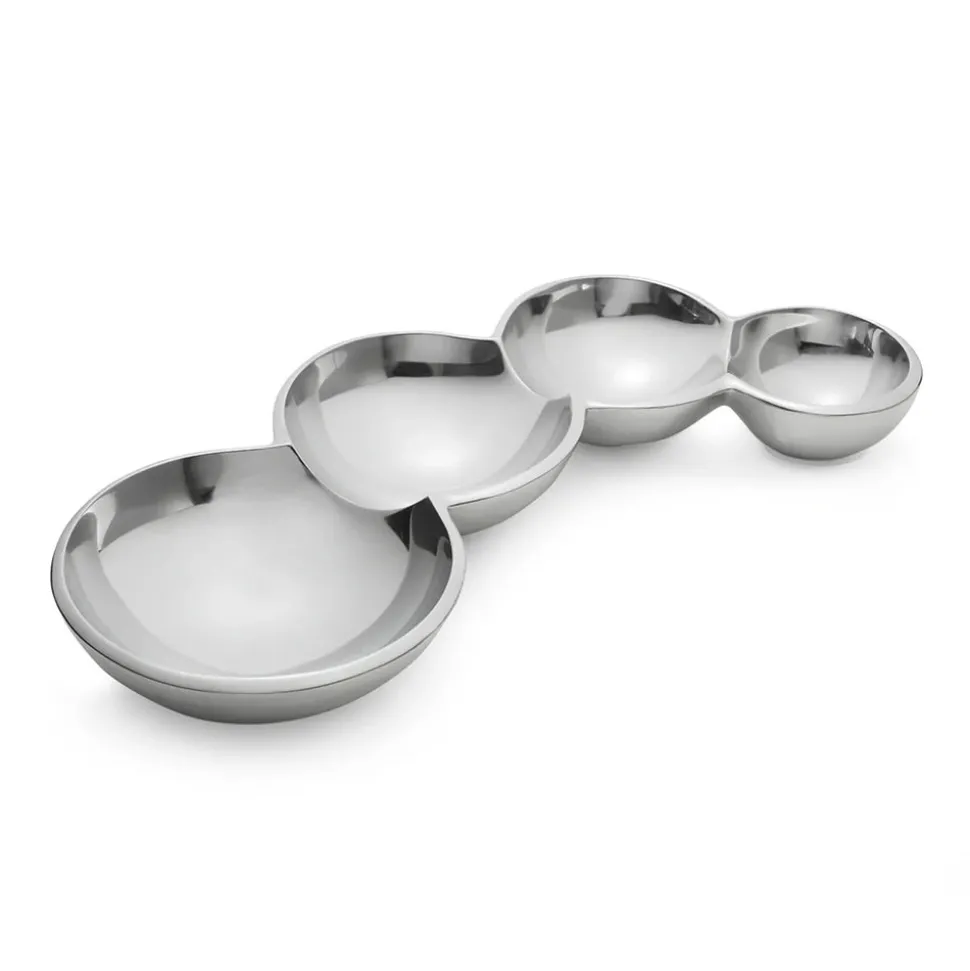 Recognized for over 60 years of award-winning design, Nambé blends timeless, refined beauty with everyday function. With pieces featured in world-renowned museums, its serveware, barware, home decor, and gifts reflect a legacy of artistry and innovation. The coyly curved set of joined bowls is as sensual as it is functional. The Caterpillar Condiment can be heated to 500 degrees. Ideal for an elegant flight of warmed condiments. Or cool it in the freezer when you plan to serve something deliciously chilled. Its timeless form and polish make it suitable for display, too; fill it with tea lights, or treasures from the beach. Designed by Lisa Smith.
