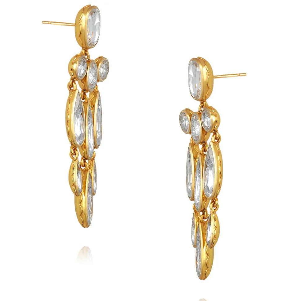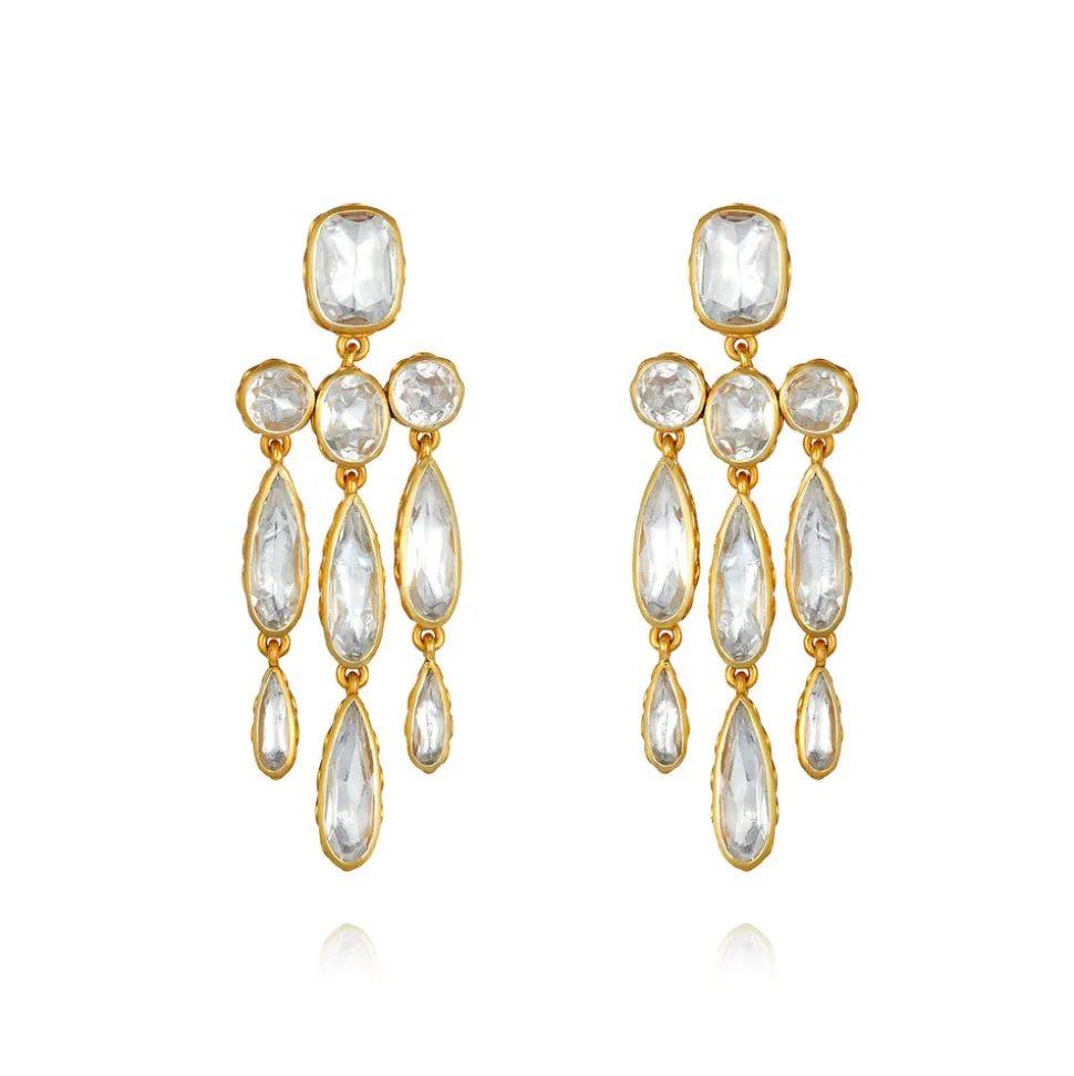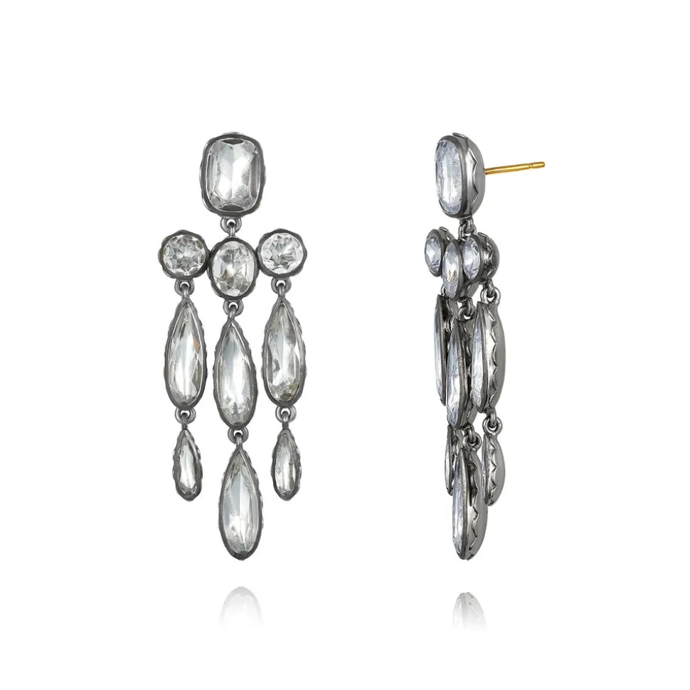 Studies in the history of decorative arts and museum curatorial work led Emily Satloff, the founder of Larkspur & Hawk, to her own esoteric line of jewelry. Applying Georgian era foil techniques, the designer uses antique jewelry, architecture and vintage textiles to inspire these thoroughly modern pieces. Designed to mimic actual crystal chandeliers, Catherine Long Girandole Earrings in White embrace British jewelry history of the 17th and 18th centuries. Defined by three pear-shaped stones, they’re as elegant as they are brilliant.