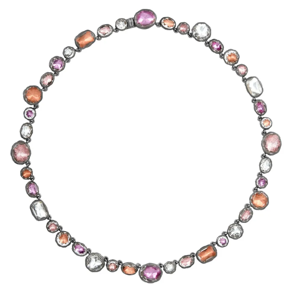 Larkspur & Hawk was founded in 2008 by designer Emily Satloff, who cultivated a passion for the foiled jewelry of the Georgian era and incorporated the technique as a signature for her pieces. A modern take on the classic rivière style, this asymmetric design and distinctive combination of foil colors are captivating.