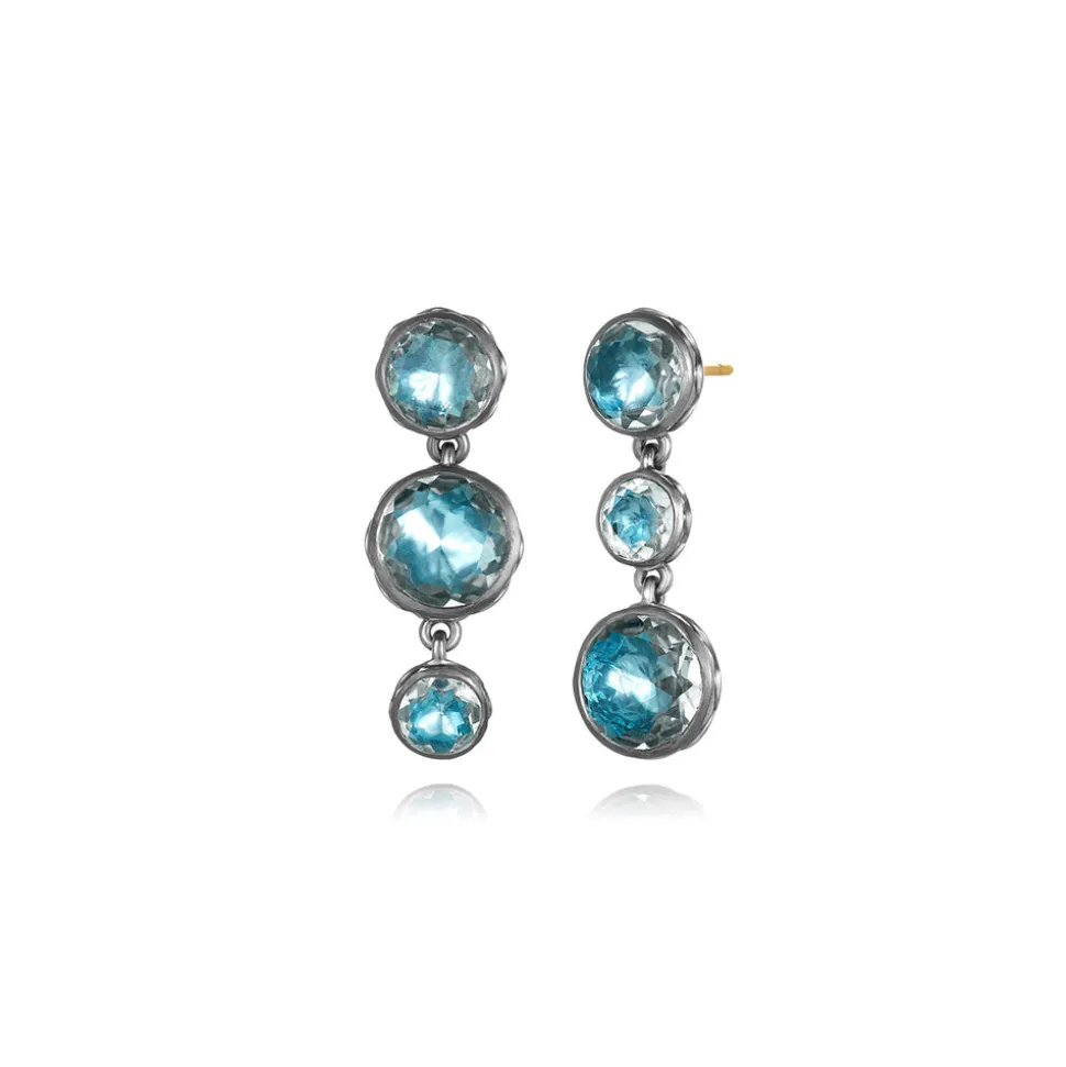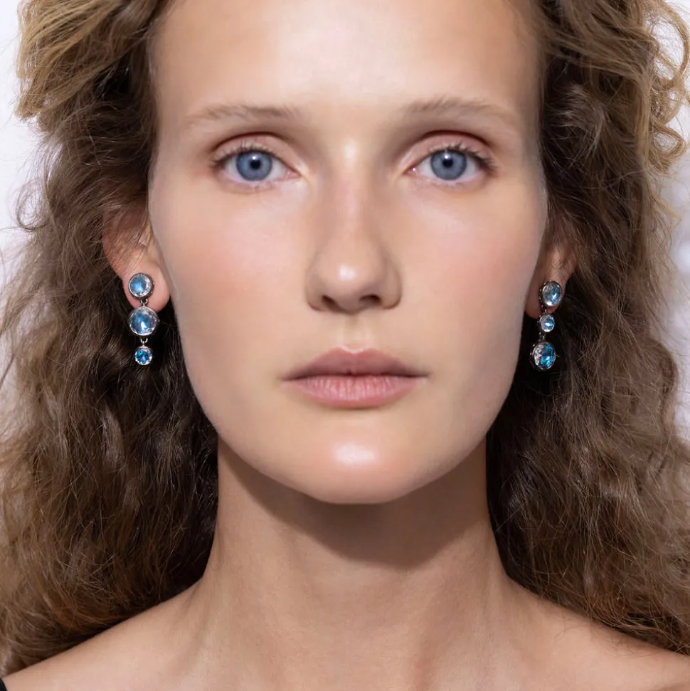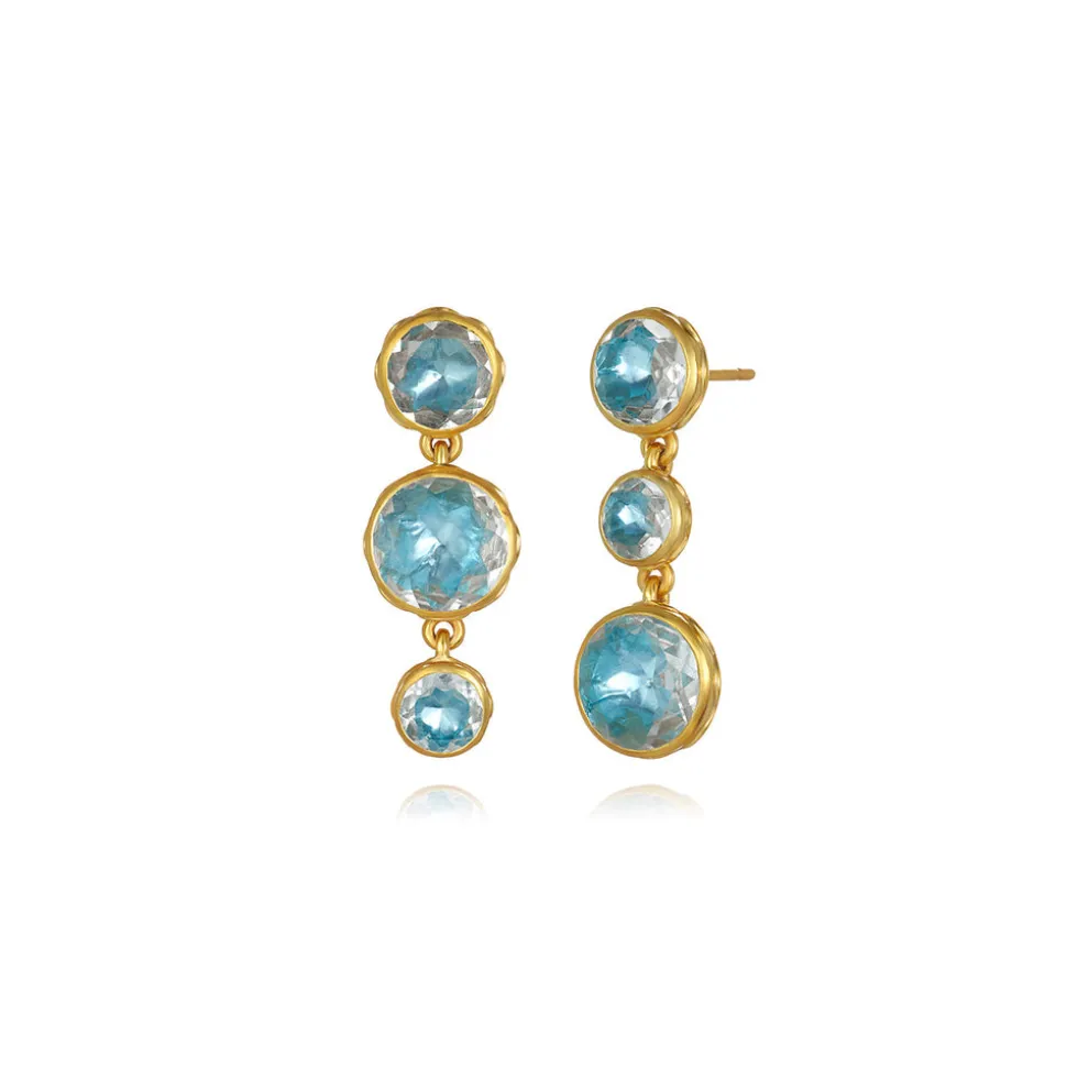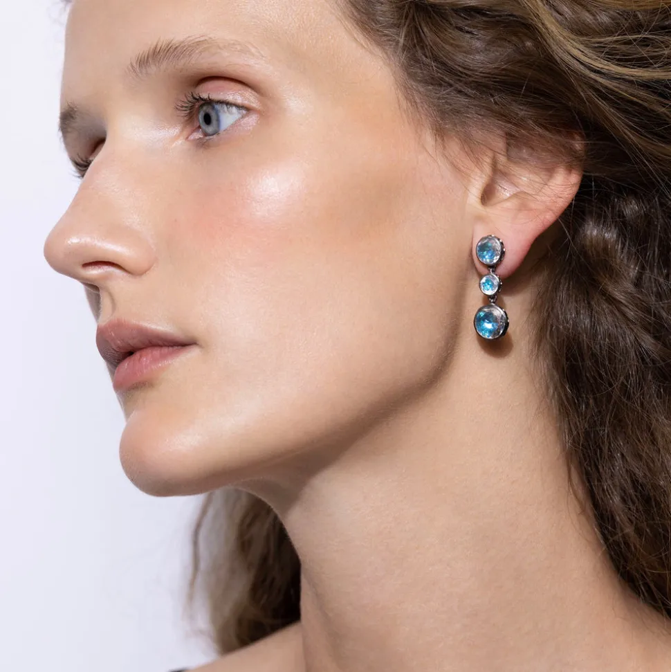 Studies in the history of decorative arts and museum curatorial work led Emily Satloff, the founder of Larkspur & Hawk, to her own esoteric line of jewelry. Applying Georgian era foil techniques, the designer uses antique jewelry, architecture and vintage textiles to inspire these thoroughly modern pieces. The interplay between the asymmetry of the different size stones, and their consistent shape, make the Catherine Round 3-Drop Earrings in Sky a fashion forward take on an absolute classic.