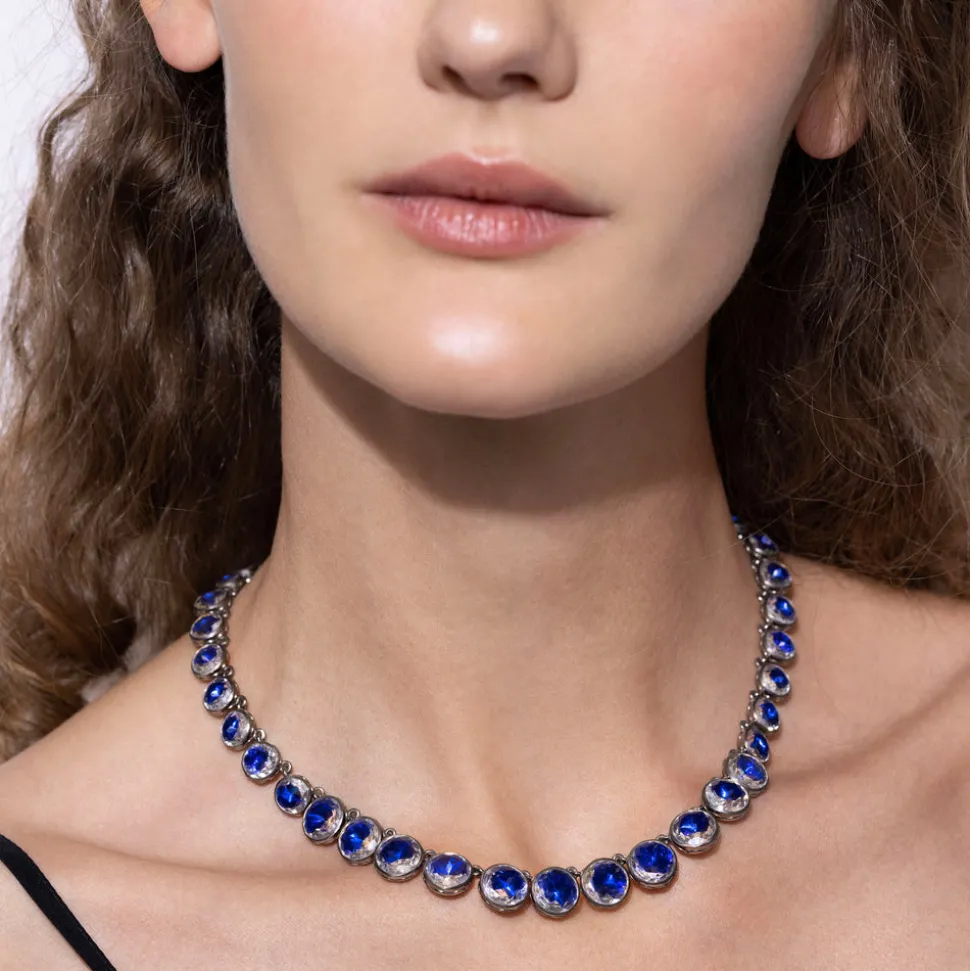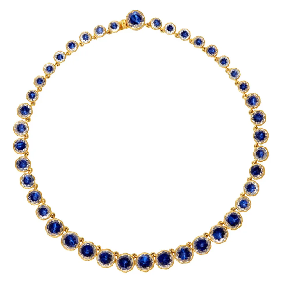 Studies in the history of decorative arts and museum curatorial work led Emily Satloff, the founder of Larkspur & Hawk, to her own esoteric line of jewelry. Applying Georgian era foil techniques, the designer uses antique jewelry, architecture and vintage textiles to inspire these thoroughly modern pieces. The Catherine Round Rivière in Indigo expresses its elegance with a graduated set of stones, featuring smooth bezels and a flat cut, which allow them to blend together, working with the curvature of the neckline as the stones grow.