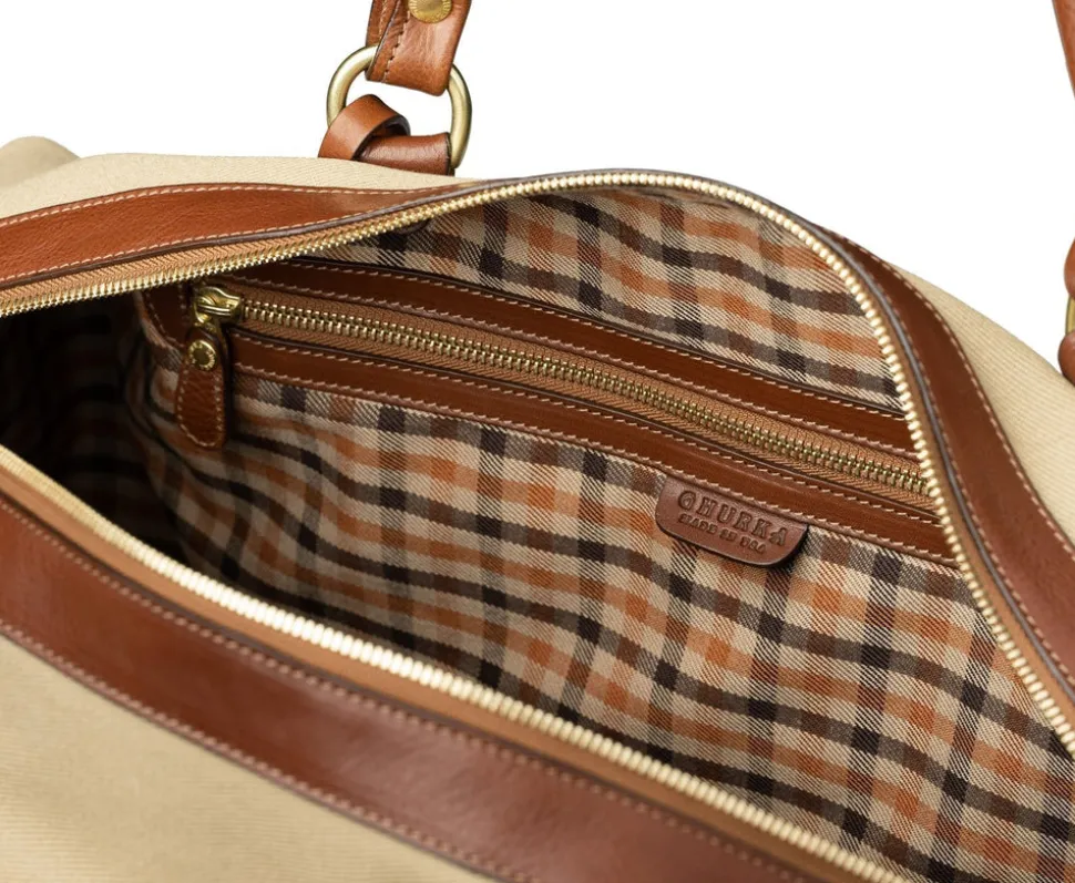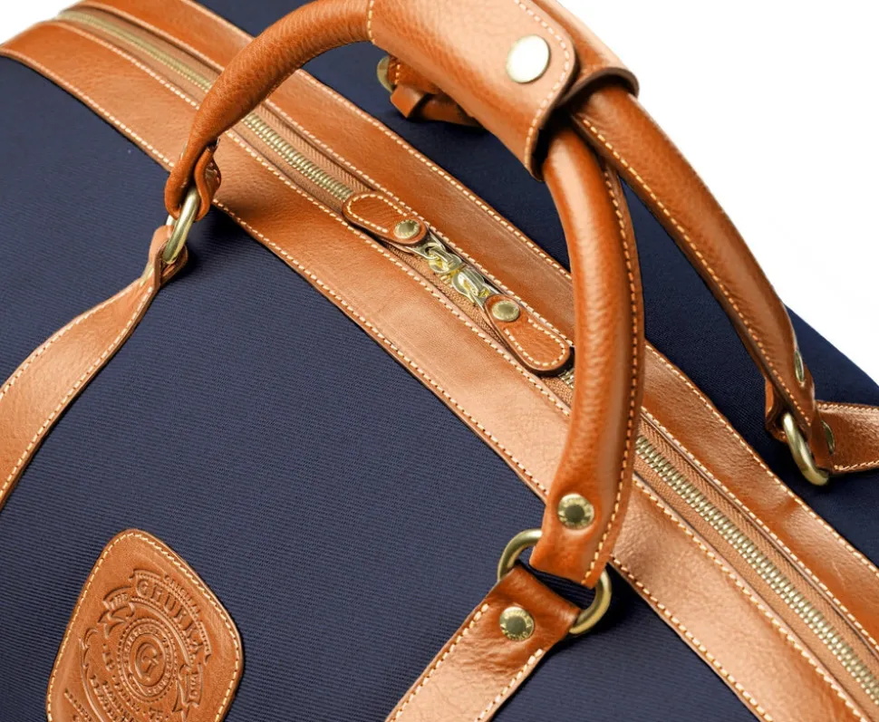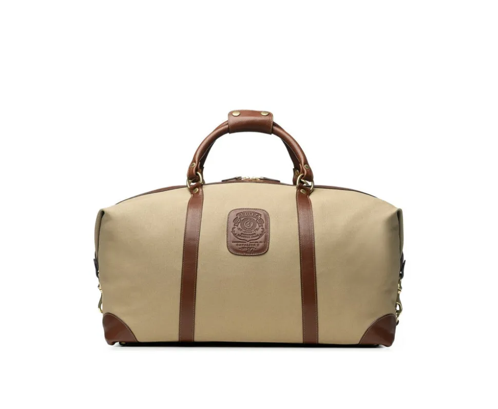 Vegetable tanned leather. Mid-size in Cavalier series; suitable for carry-on. Dual top handles with 5” drop. Cotton twill lining. 12″ interior zipper pocket. Luggage tag included. Unique registration number per bag.