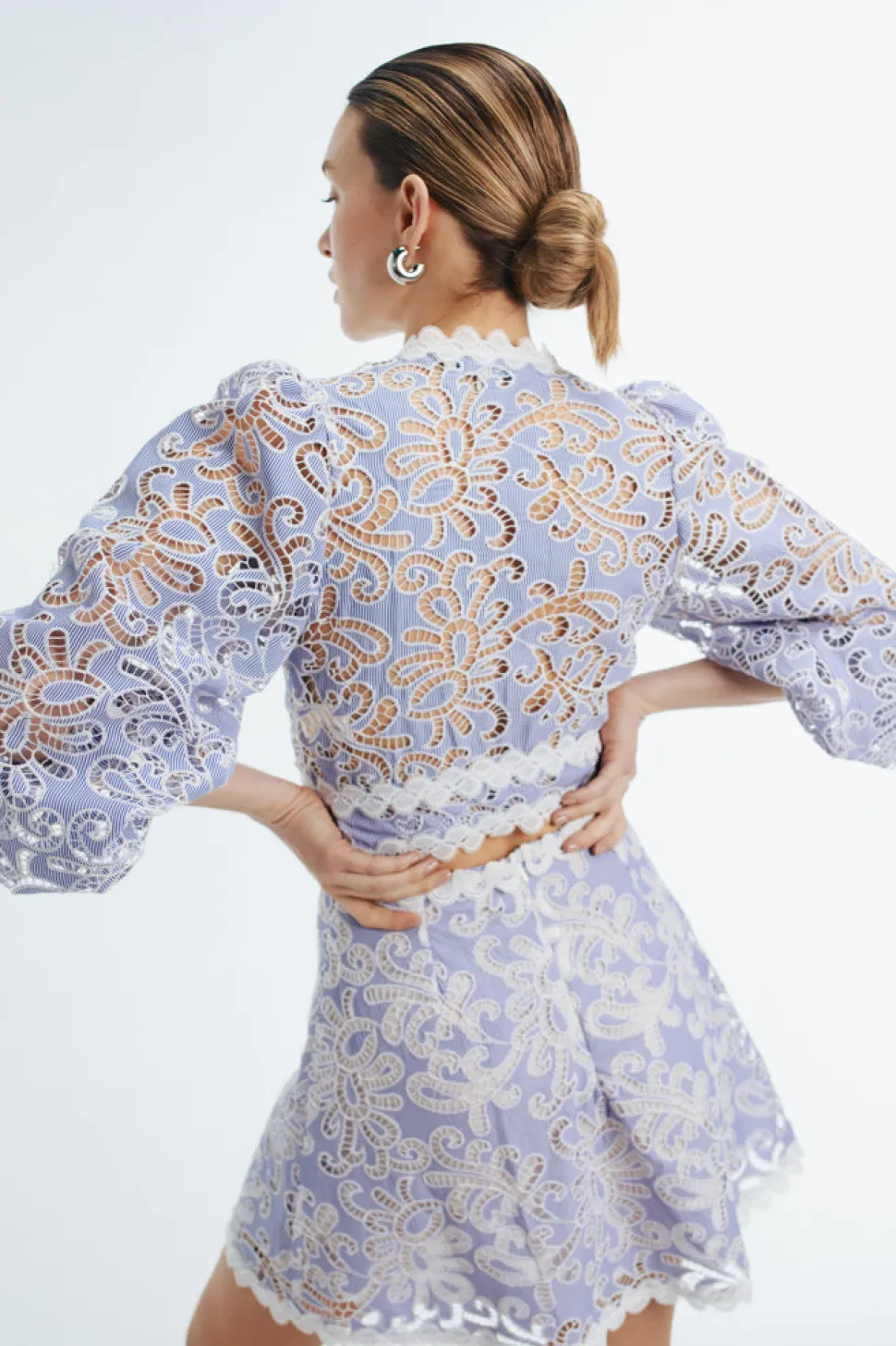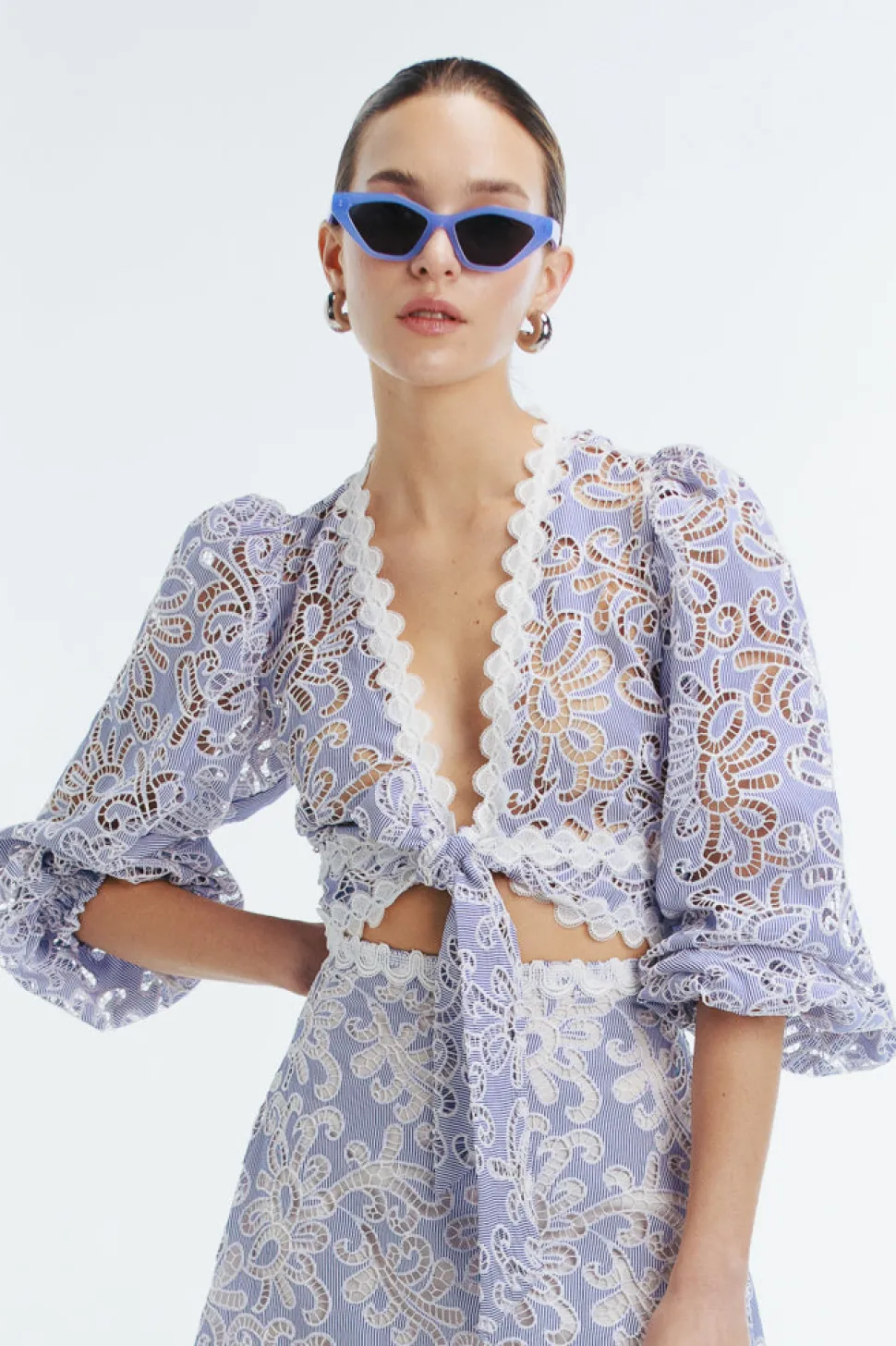 Every WAIMARI piece has a story. Started by two Colombian sisters, the brand is passionate about what goes into their resort wear, embracing the traditions of the local craftspeople they employ and focusing on both the sustainability and quality of their investment pieces. The Cecil Top in Ble is a deep V-neck crop top with puffed long sleeves and elastic cuffs. Completely sheer, it ties at the front with a knot and is adorned with delicate lace trims along the neckline and waistband. Crafted from embroidered cotton eyelet fabric with subtle stripes.