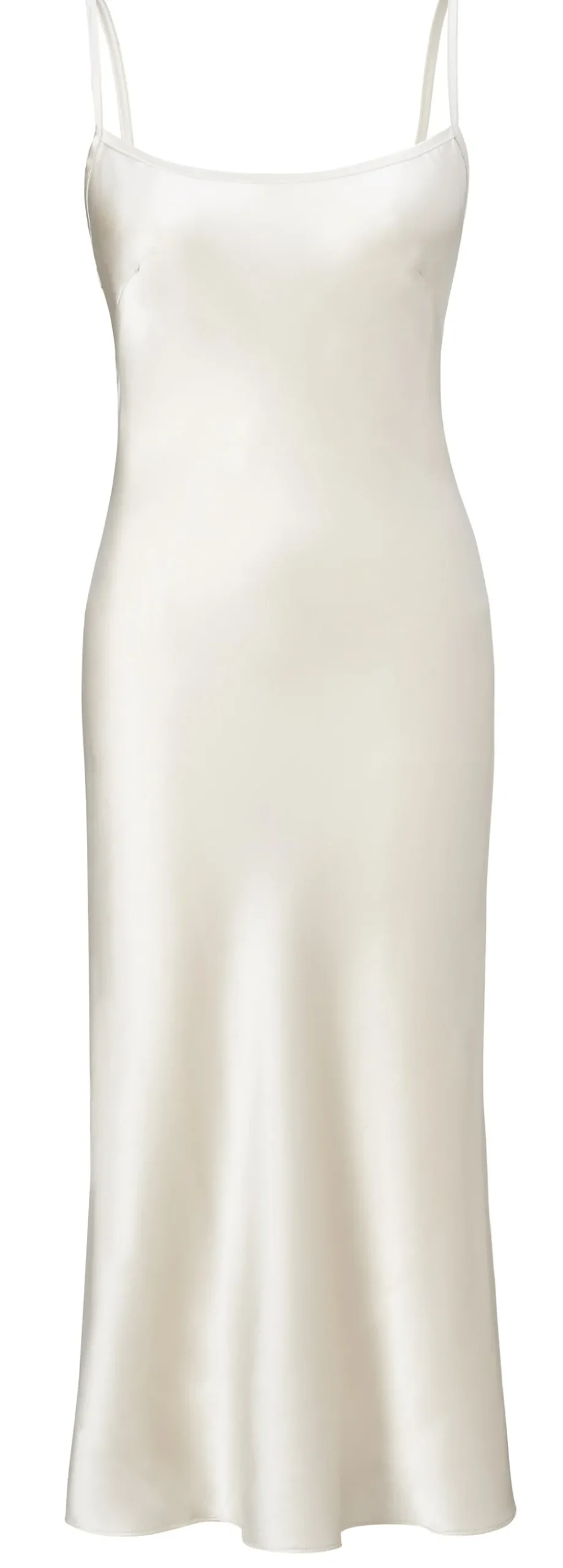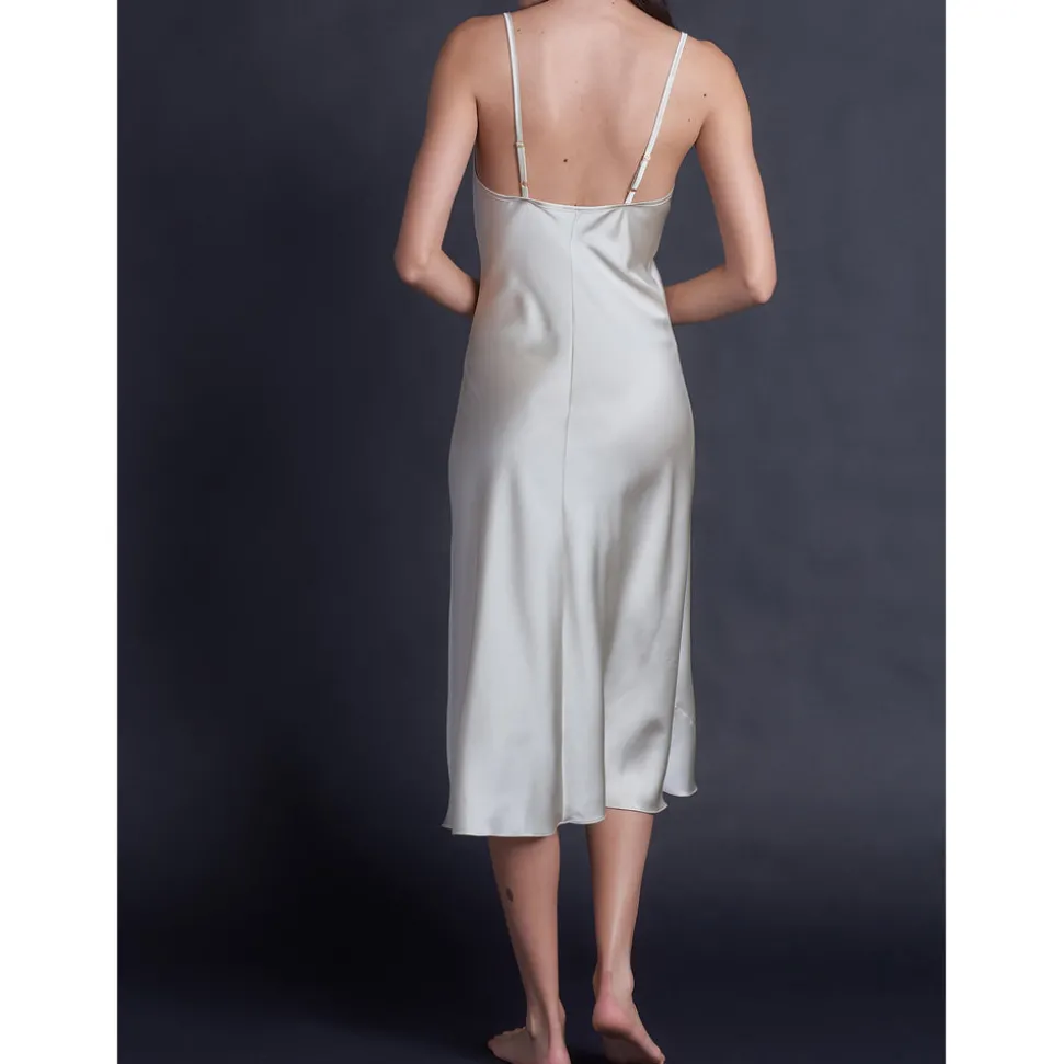 The Celeste Pearl Silk Slip is a classic piece of feminine nightwear with a flattering hem. The curved neckline features single straps, which are fully adjustable with custom 18k gold twice-plated sliders. The gently flared hemline slopes gracefully just below the knee for an elegant silhouette.