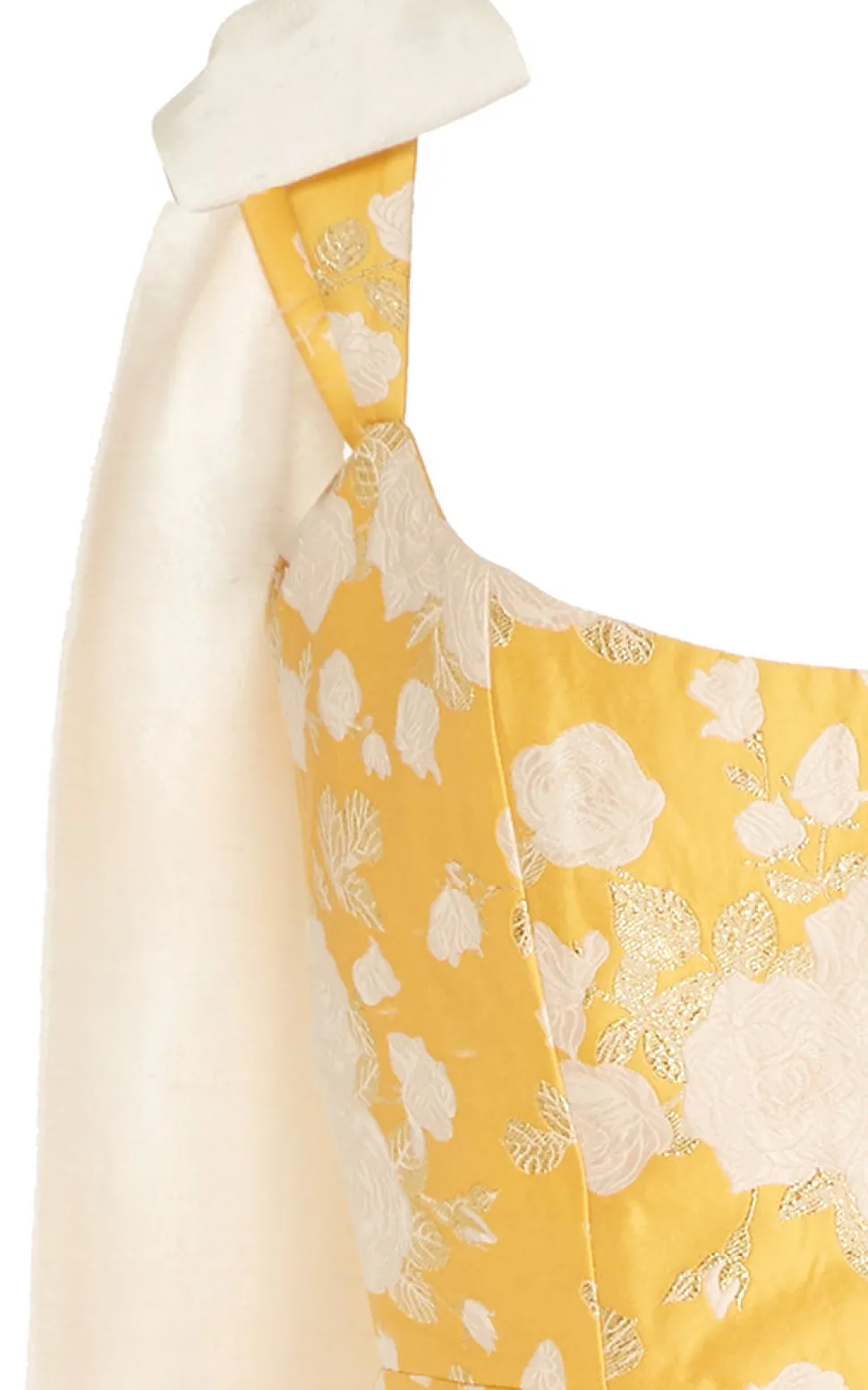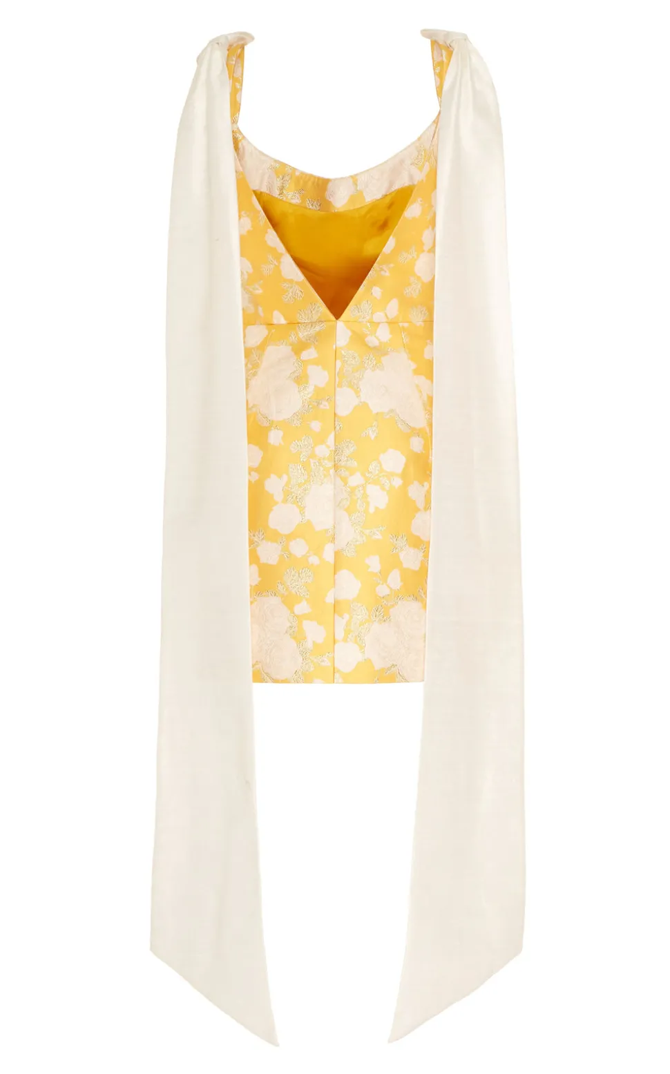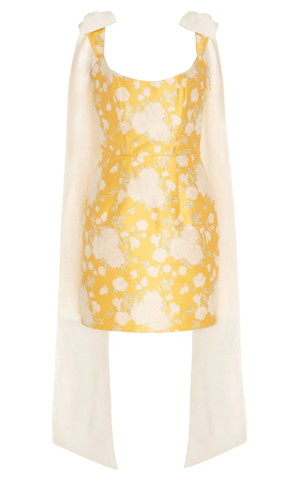 Named after a particularly radiant group of galaxies, Markarian combines designer Alexandra O’Neill’s love of the cosmos and celestial romanticism with timeless design and modern silhouettes. A forward-thinking approach to fashion and focus on fine craftsmanship mean Markarian is beautiful, well-made, and flattering. To that end, the Celestia Yellow Floral Brocade Corset Mini Dress is cut sleeveless, in a mini length, and features white, silk dupioni shoulder bows.