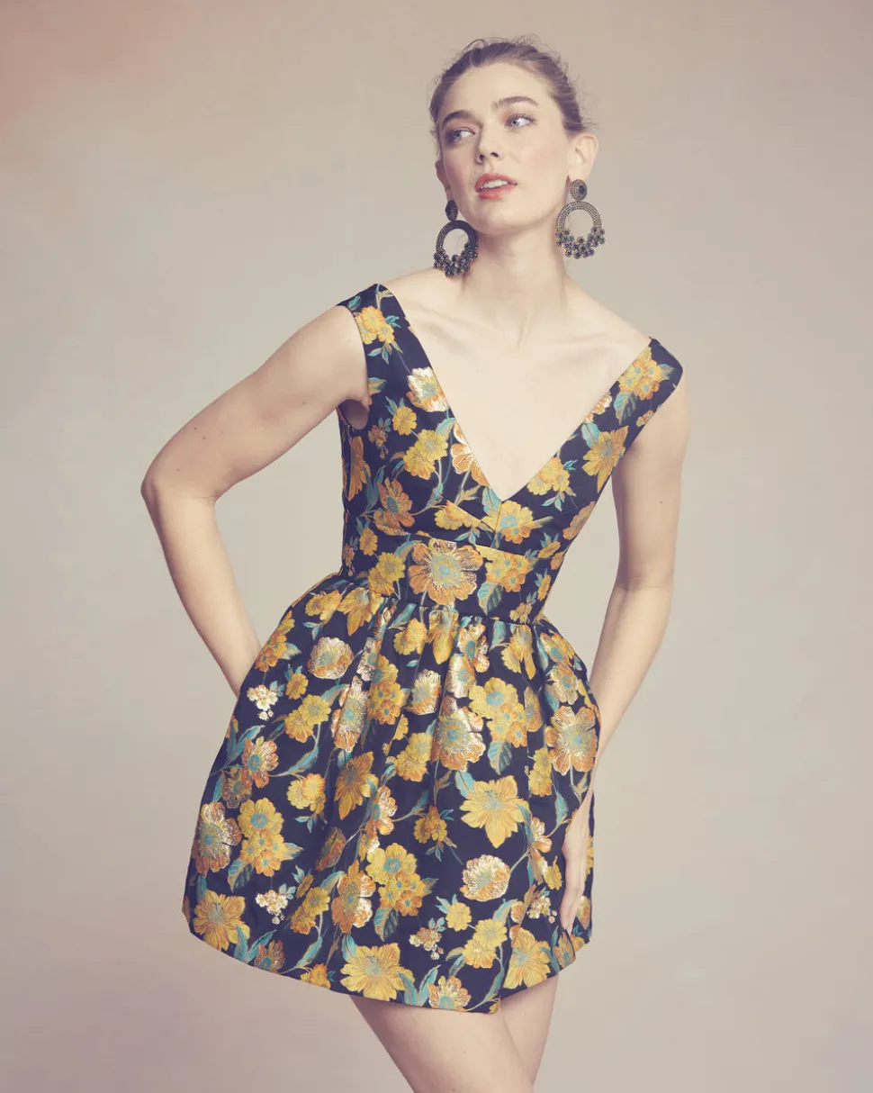 A graduate of the Savannah College of Design, award-winning Alexandra Pijut’s namesake line arrives from her studio in New York, offering luxe ready-to-wear pieces that distinguish themselves between femininity and practicality. This feminine style features a wide set, V-neckline and gathered skirt with luxurious brocade fabric in citrine, turquoise, and metallic gold florals that exude luxury and reflect light with every movement.