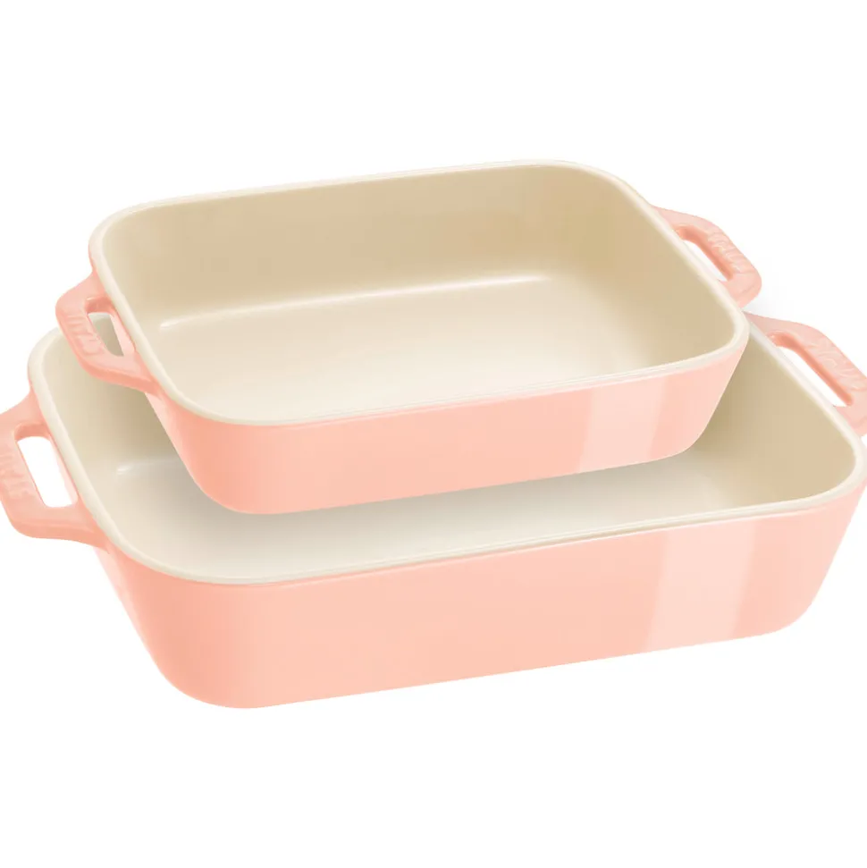 Rooted in French culinary heritage, Staub is beloved by professional and home chefs for its exquisite craftsmanship, exceptional performance, and timeless beauty. Staub rectangular stoneware bakers gently retain heat and won’t absorb moisture, producing a delicious result for all your favorite dishes. The Ceramic 2-pc Rectangular Baking Dish Set in Macaron Pastel Pink is ideally sized for everything from savory lasagna to delicious desserts. The porcelain enamel glaze prevents absorption of moisture during baking, so foods won’t dry out, while a different shapes allow these attractive vessels to bring everything from grilled meets to bubbling cobbler from the oven right to the table for service.
