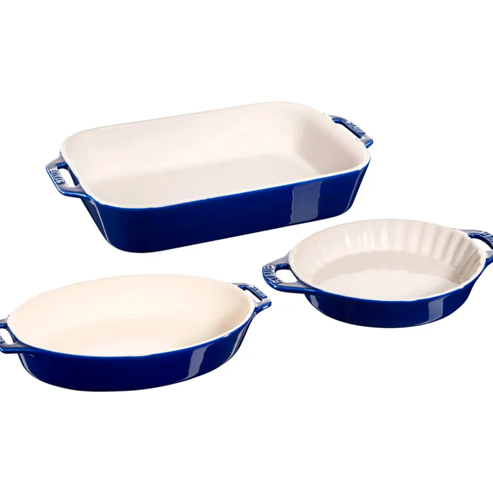 Rooted in French culinary heritage, Staub is beloved by professional and home chefs for its exquisite craftsmanship, exceptional performance, and timeless beauty. Staub rectangular stoneware bakers gently retain heat and won’t absorb moisture, producing a delicious result for all your favorite dishes. The Ceramic 3-pc Mixed Baking Dish Set in Dark Blue is ideally sized for everything from savory lasagna to delicious desserts. The porcelain enamel glaze prevents absorption of moisture during baking, so foods won’t dry out, while three different shapes allow these attractive vessels to transport everything from grilled meets to bubbling cobbler from the oven right to the table for service.