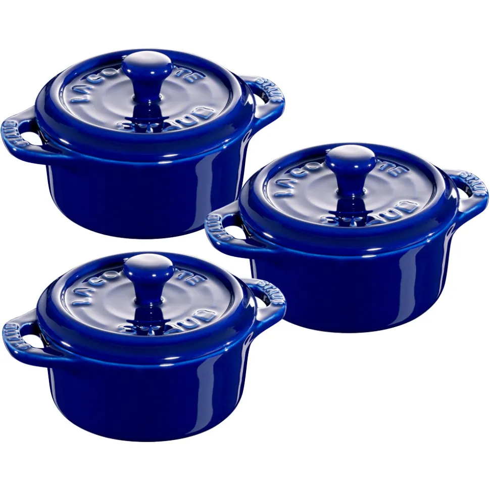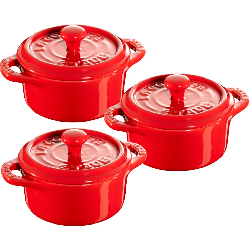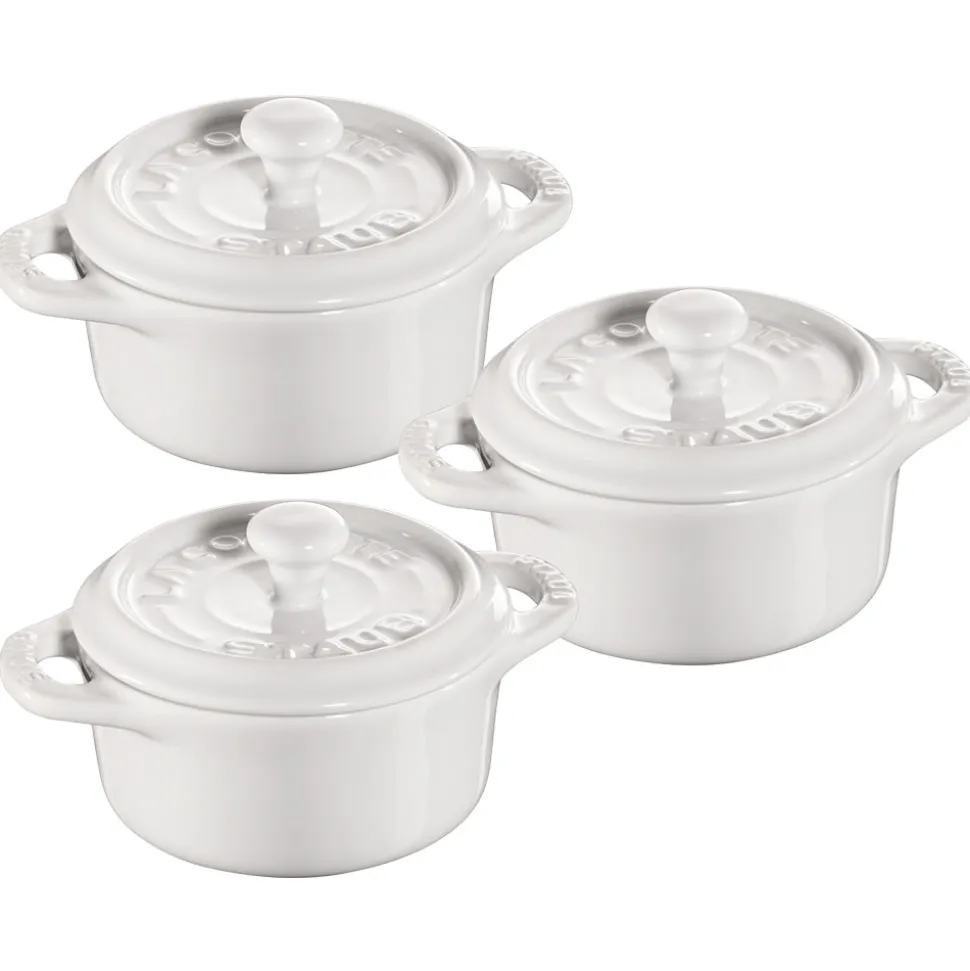 The elegance and functionality of Staub ceramics go from freezer to oven to table. The glass porcelain finish matches Staub’s cast iron to mix perfectly on your tabletop. Oven and broiler safe up to 572˚F, ceramics can also be used in the microwave and are dishwasher safe. Highly scratch, impact, and thermal shock resistant. The Staub Ceramic 3-pc Mini Cocotte Set is a versatile addition to any kitchen. Store salt and pepper on the counter for quick access, bake up individual desserts or serve your favorite mac & cheese recipe.