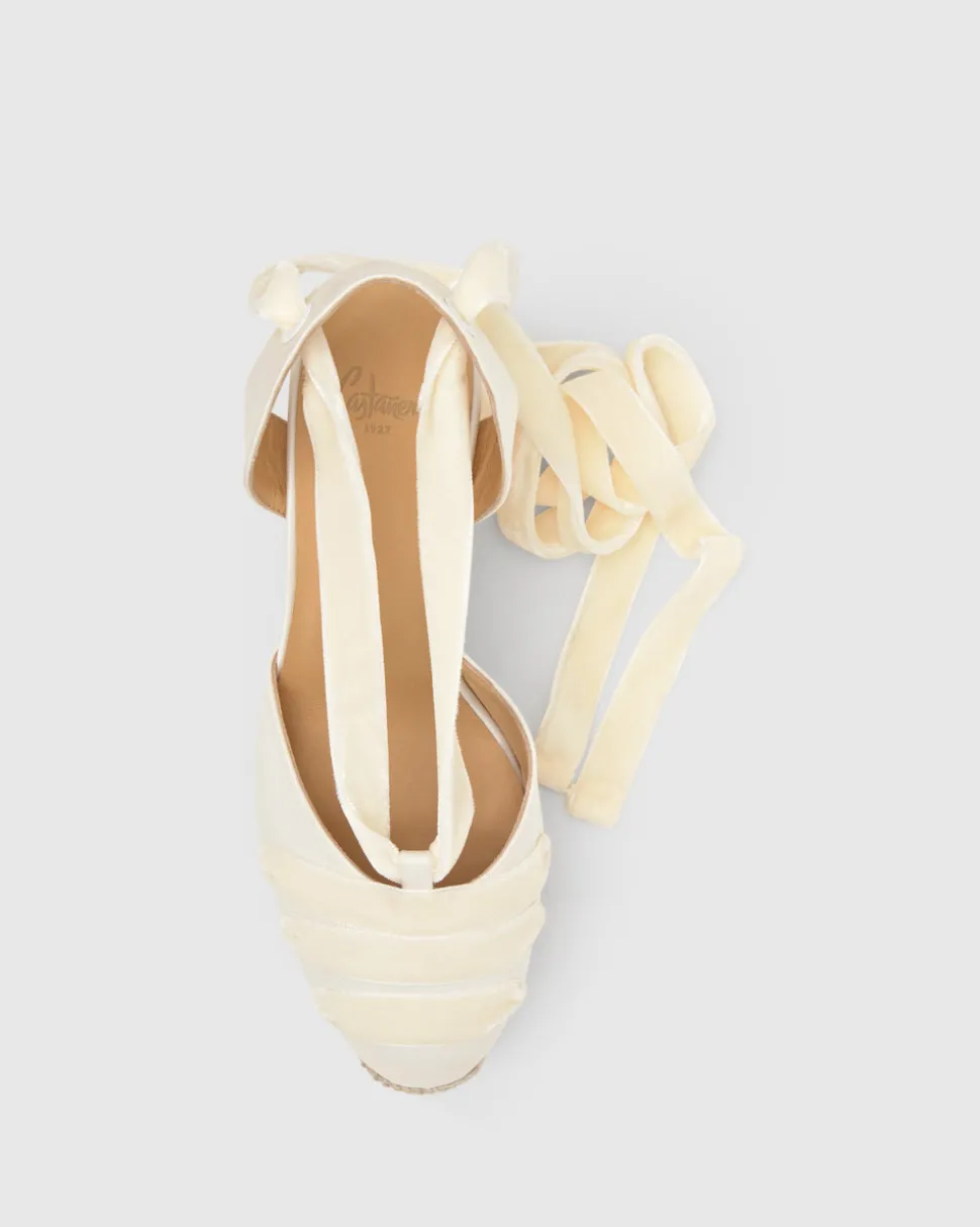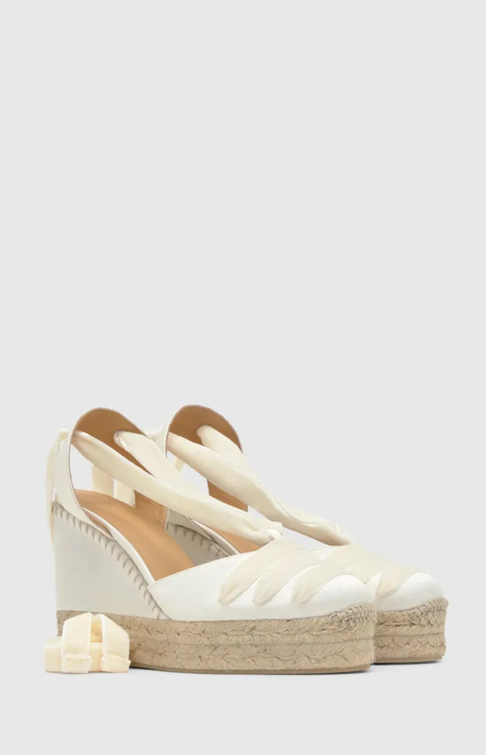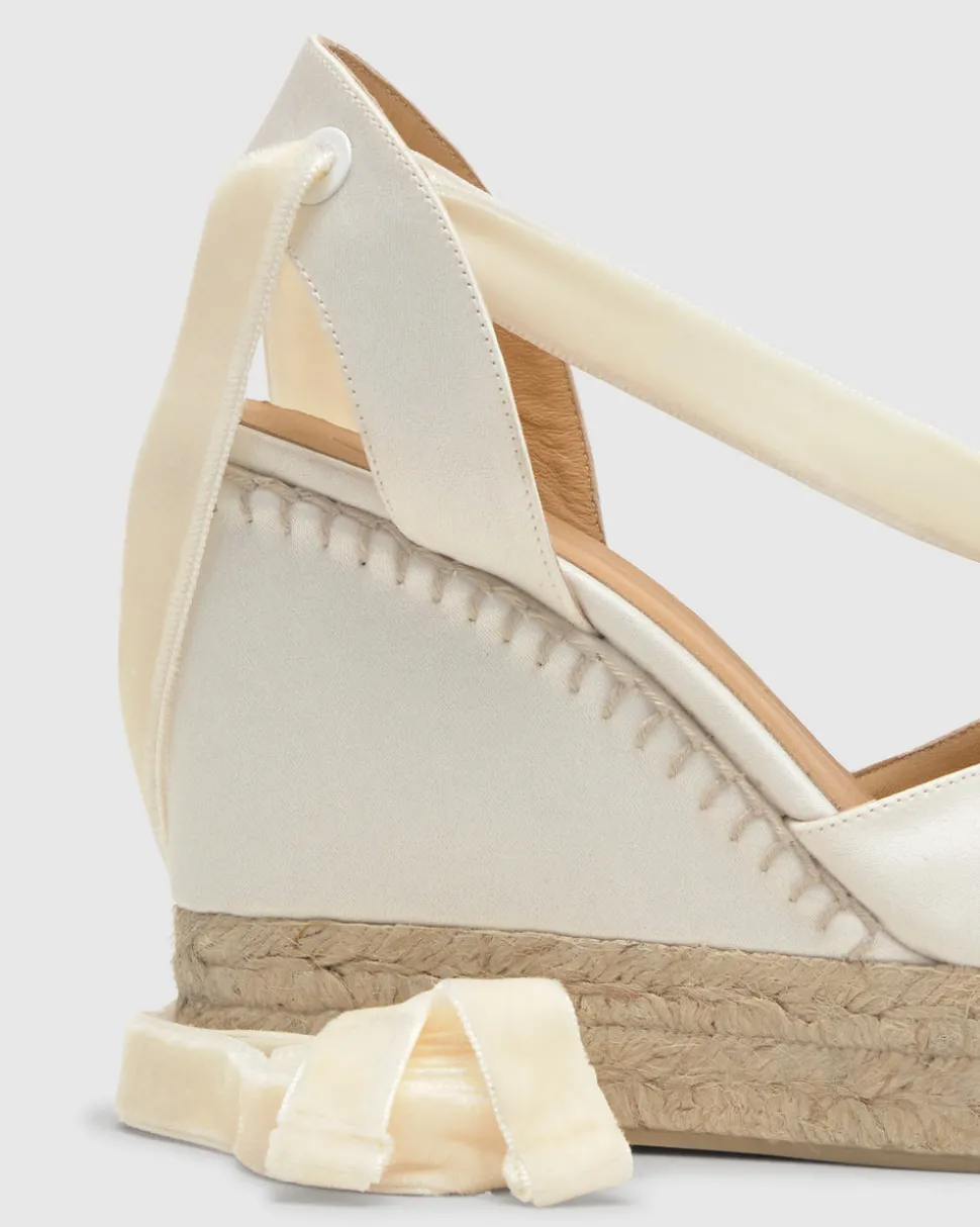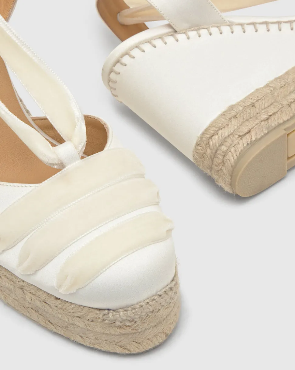 Founded in 1927, Castañer has elevated the espadrille into a sophisticated symbol of timeless design. With a commitment to craftsmanship, tradition, and natural materials, the brand continues to blend heritage with innovation, earning global recognition while staying true to its authentic roots. The Cersei 8ED in Écru is a women’s espadrille sandal crafted in satin with a velvet bow closure and cushioned insole and a double platform wedge heel combined in jute and satin.