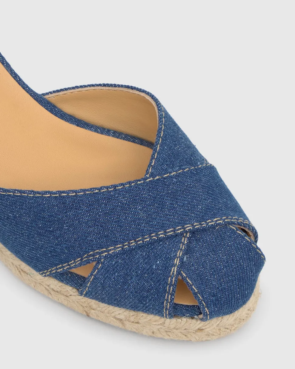 Denim upper. Ribbon tie closures. Semi-open toe. Cushioned insole. 7″ jute wedge heel with matching wrap.
