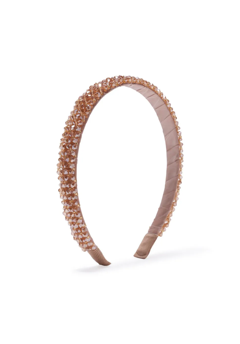 Our new champagne crystal and beaded, hand-wired headband. Placed on a bronze satin 1 inch band. An elegant addition to any outfit, night or day.