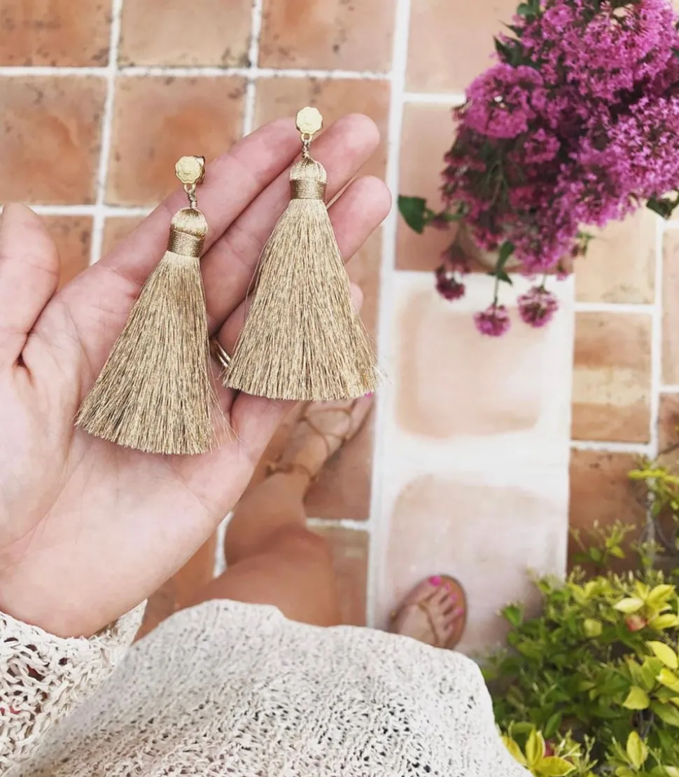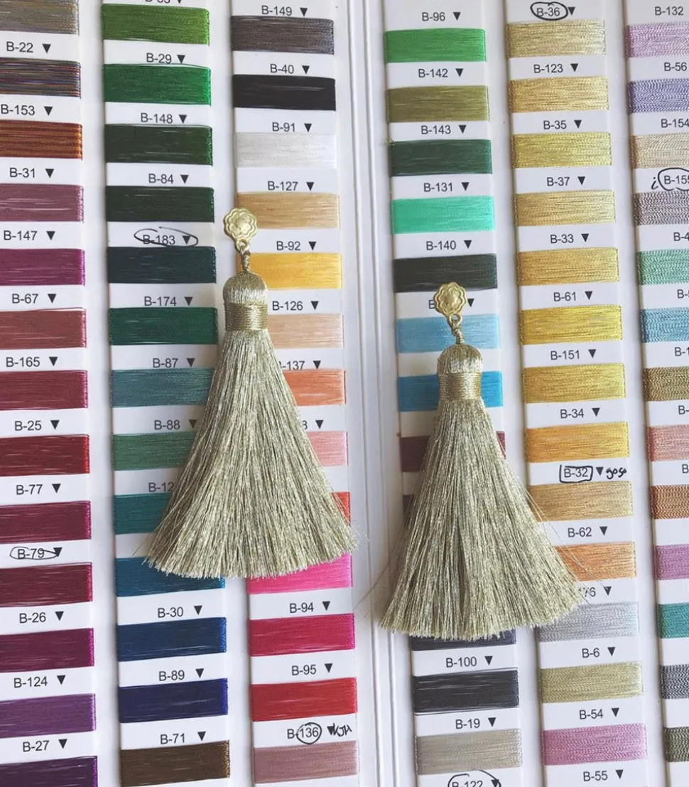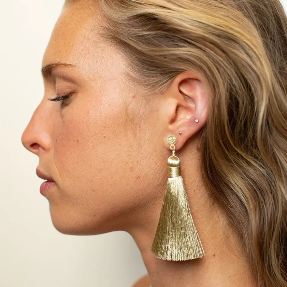 Featherlight polyester tassel. Thread is stiff and holds its shape well. 18-karat gold-plated stud earrings with post push back. Suitable for sensitive ears.