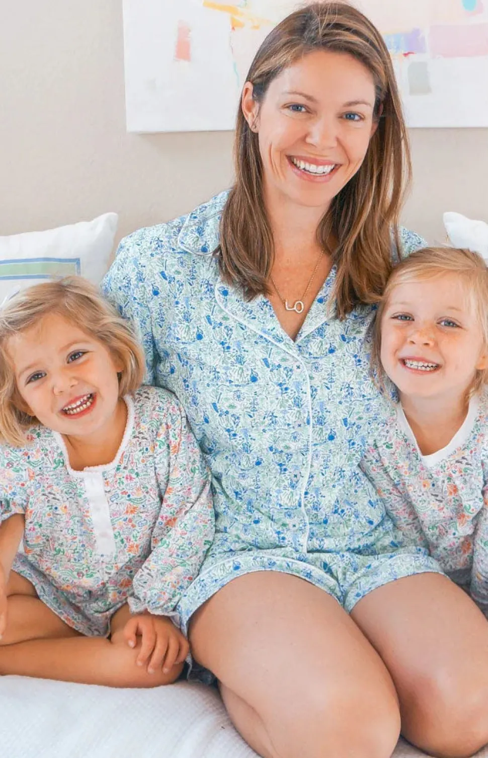 100% Peruvian Pima cotton. Hand-drawn print by founder. Button front top with elastic shorts with grosgrain draw cord.