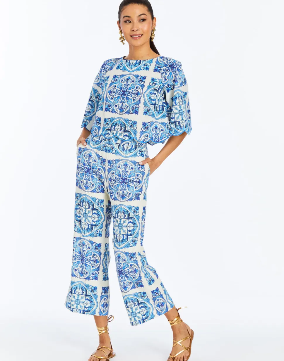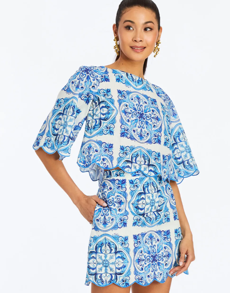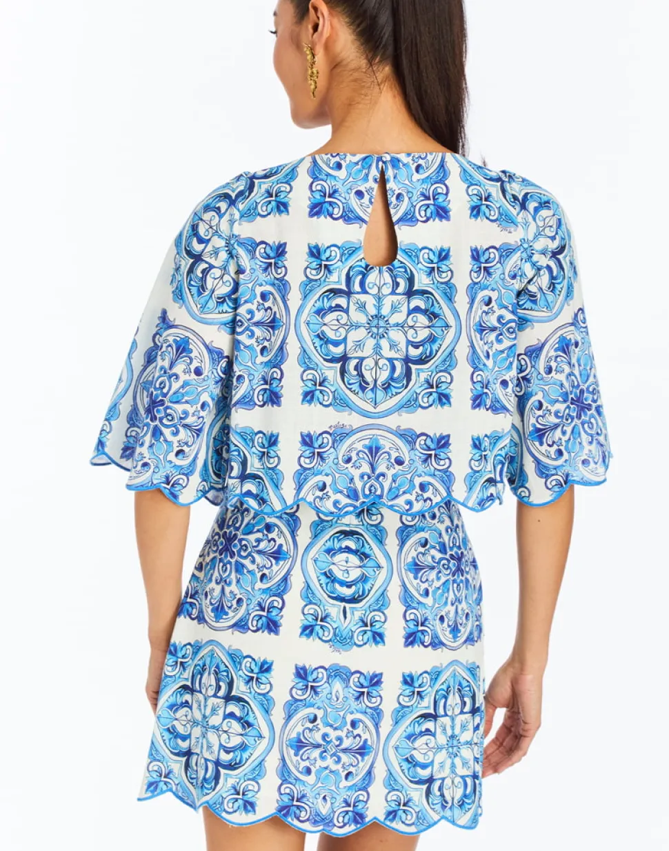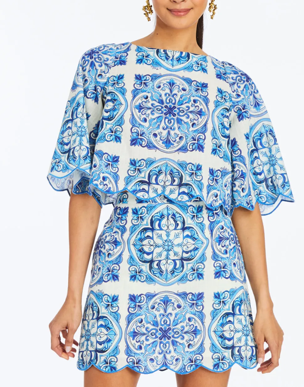 100% cotton. Scalloped top featuring a boat neckline. Keyhole at back neck. Scallop detailing at hem and sleeve ends. Wide bell sleeves hit at elbow length. Coordinating set with the Pilar Mini Skirt.