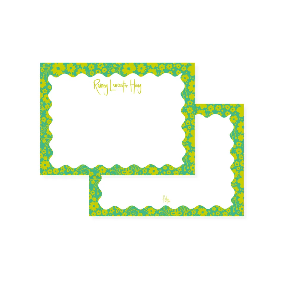 Set of 15 digitally handwritten stationery cards. 220 lb. paper. Includes 15 chartreuse envelopes with matching liners. Handmade in the USA. Personalization available—please specify name or initials in notes at checkout. Each set is made to order and may vary slightly due to its crafted nature.