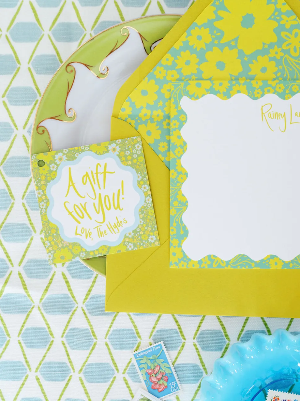 Drawing on a lifelong passion for hospitality and design, founder Mahaley Aguayo transforms everyday moments into extraordinary celebrations through Fête Papier’s curated paper goods and party accessories. With a blend of Southern warmth and modern sophistication, each design invites effortless charm and creates memories destined to be cherished. The Chartreuse Ditsy Floral Stationery Set showcases a vibrant floral motif and whimsical handwriting, making everyday notes feel uniquely personal. Customized with a name or initials, it’s a lovely way to elevate correspondence with color and charm.