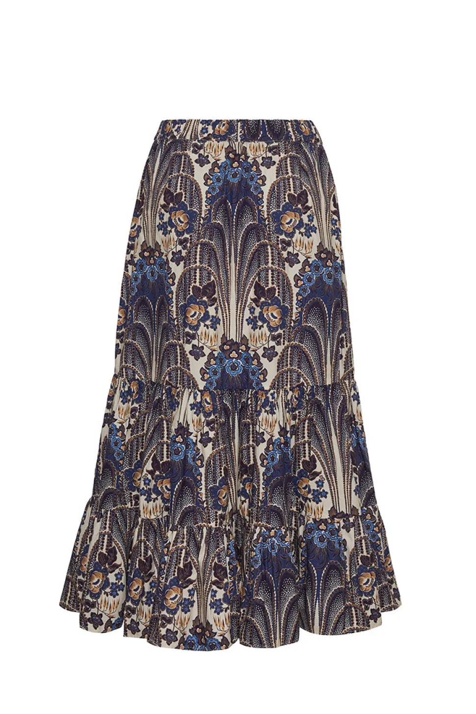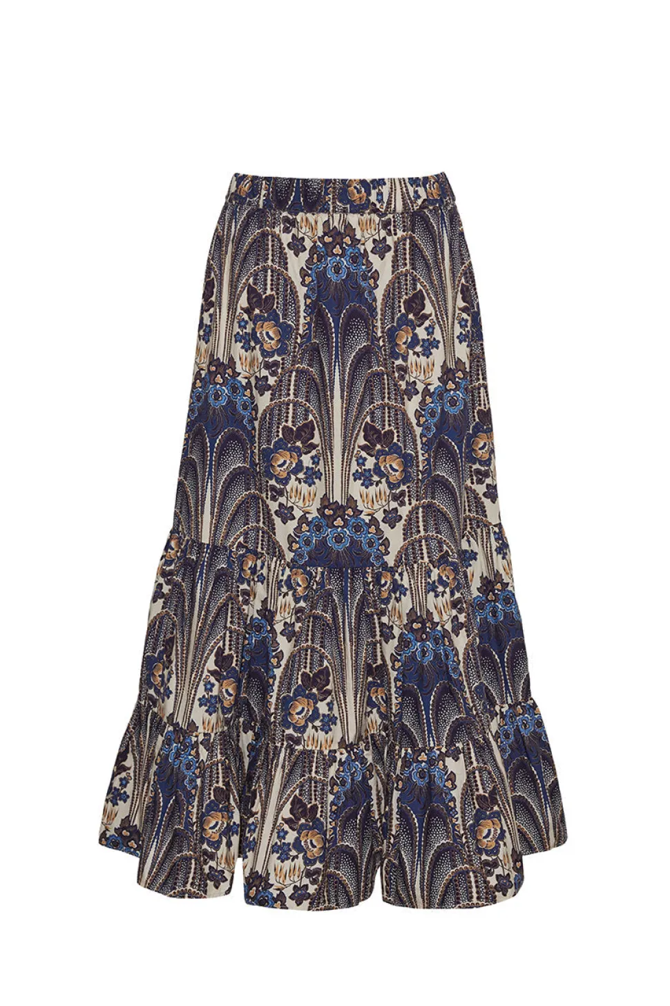 Founded by three New York City-based mothers who met through their kids, Cara Cara’s hallmarks include crisp poplin, house-designed prints, and casual glamour. The inspiration for their ethical womenswear comes from interior design, as well as the world’s most exotic locales. The Chase Skirt in Fontaine Egret features a tiered A-line silhouette crafted from breathable cotton poplin, paired with an elastic waistband that allows styling high or low on the hips. Its double-tiered midi length and placed print bring a fresh sense of ease to casual wardrobes.