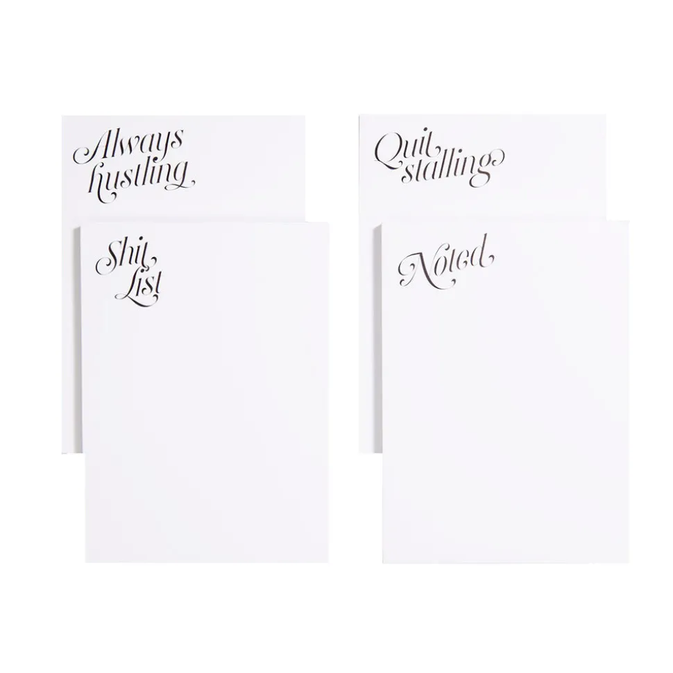 50 sheets per pad. Script in bold black ink. Set of 4. Bright white smooth paper. One of each design per set: Always Hustling, Shit List, Quit Stalling, Noted. Made in New York City.