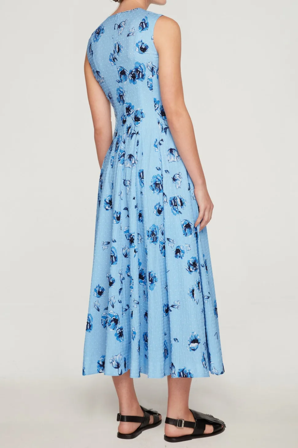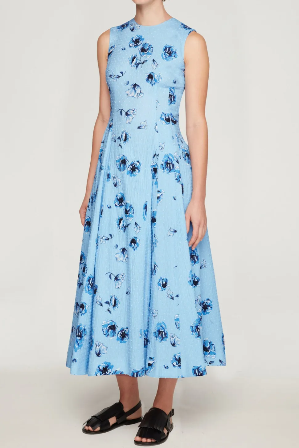 Emilia Wickstead is the epitome of modern femininity. Established in the U.K. in 2008, the ready-to-wear designer is known for impeccable tailoring, bold color, and timeless quality. The Chelsea Dress in Blue Poppies on Baby Blue Bibione Cotton captures effortless elegance through a universally flattering silhouette. Crafted from lightweight, textured cotton and printed with a delicate blue floral motif, it features a fitted bodice and generously gathered skirt that bring both grace and ease to summer dressing.