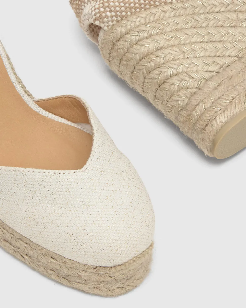 Founded in 1927, Castañer has elevated the espadrille into a sophisticated symbol of timeless design. With a commitment to craftsmanship, tradition, and natural materials, the brand continues to blend heritage with innovation, earning global recognition while staying true to its authentic roots. The Chiara 8ED in White/Gold is a crafted in metallic linen with a lace-up closure, padded insole, V-neck, and a jute and lurex wedge with double platform.