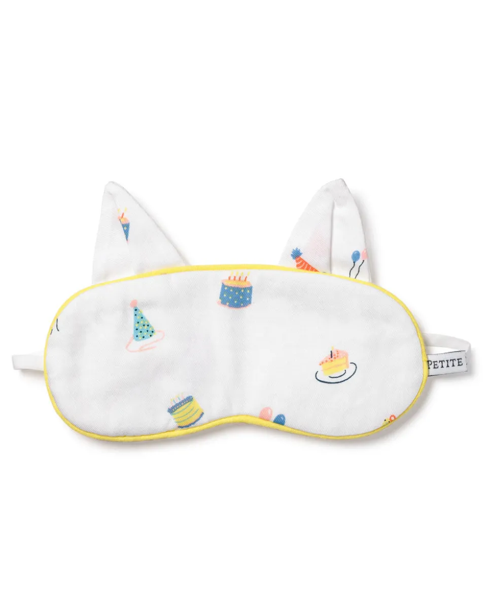 Petite Plume’s luxury sleepwear is a dream come true. Crafted in exquisite cotton with the finest attention to detail, Petite Plume delivers the utmost comfort and sophistication. All rendered in an artful palette of coral, blue, teal, and gold, the Children’s Birthday Wishes Kitty Sleep Mask features striped party hats, cake with candles, beribboned presents, and balloons.