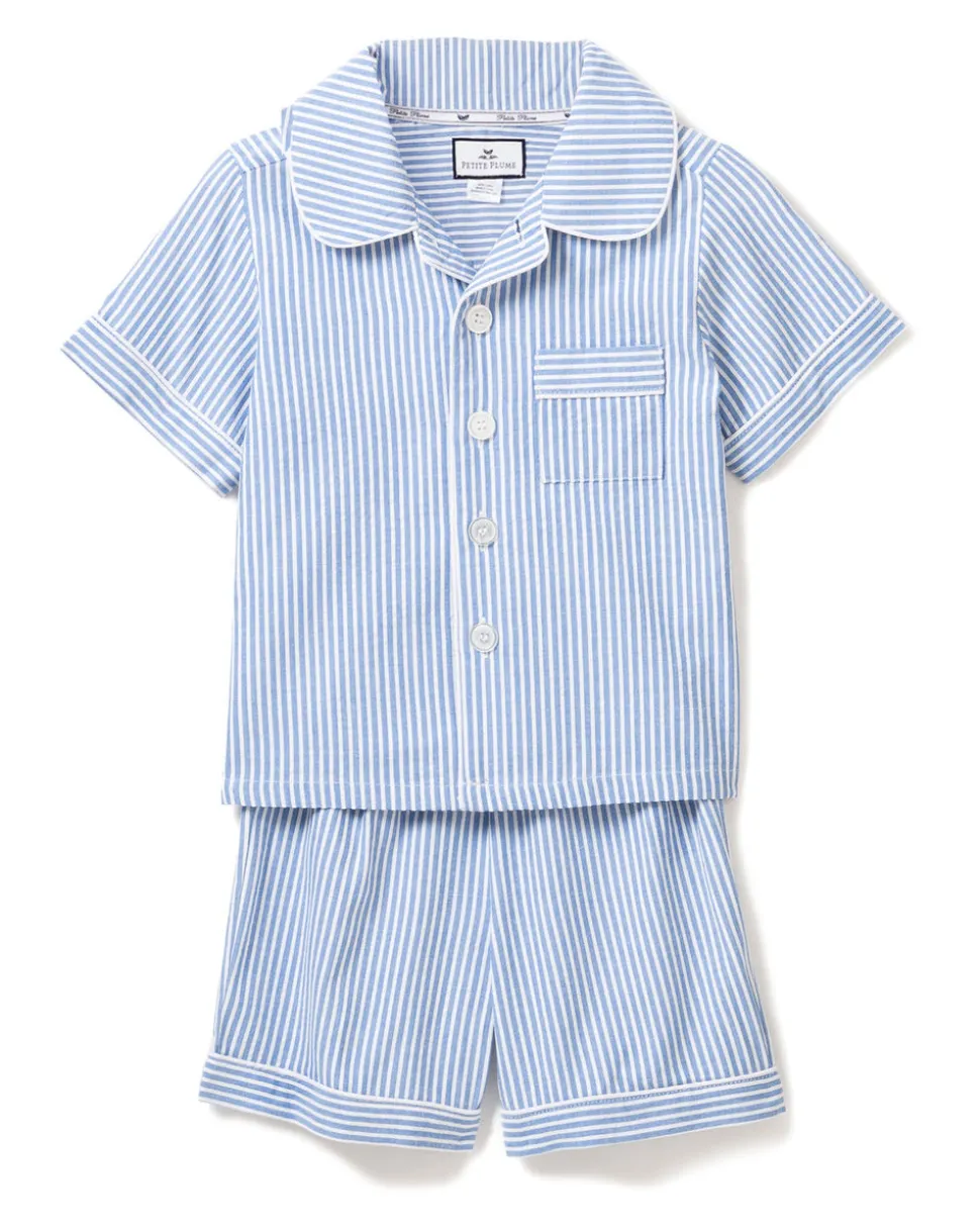Petite Plume’s luxury sleepwear is a dream come true. Crafted in exquisite cotton with the finest attention to detail, Petite Plume delivers the utmost comfort and sophistication. Seersucker is the ultimate warm-weather material due to its lightweight quality. This classic short set is accented with white piping and finished with pearl buttons.