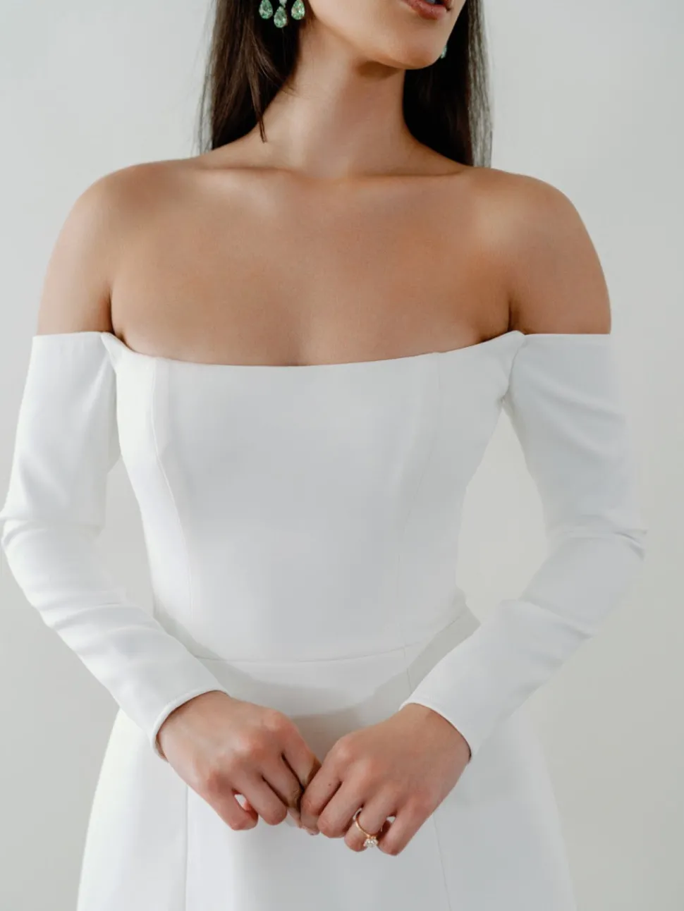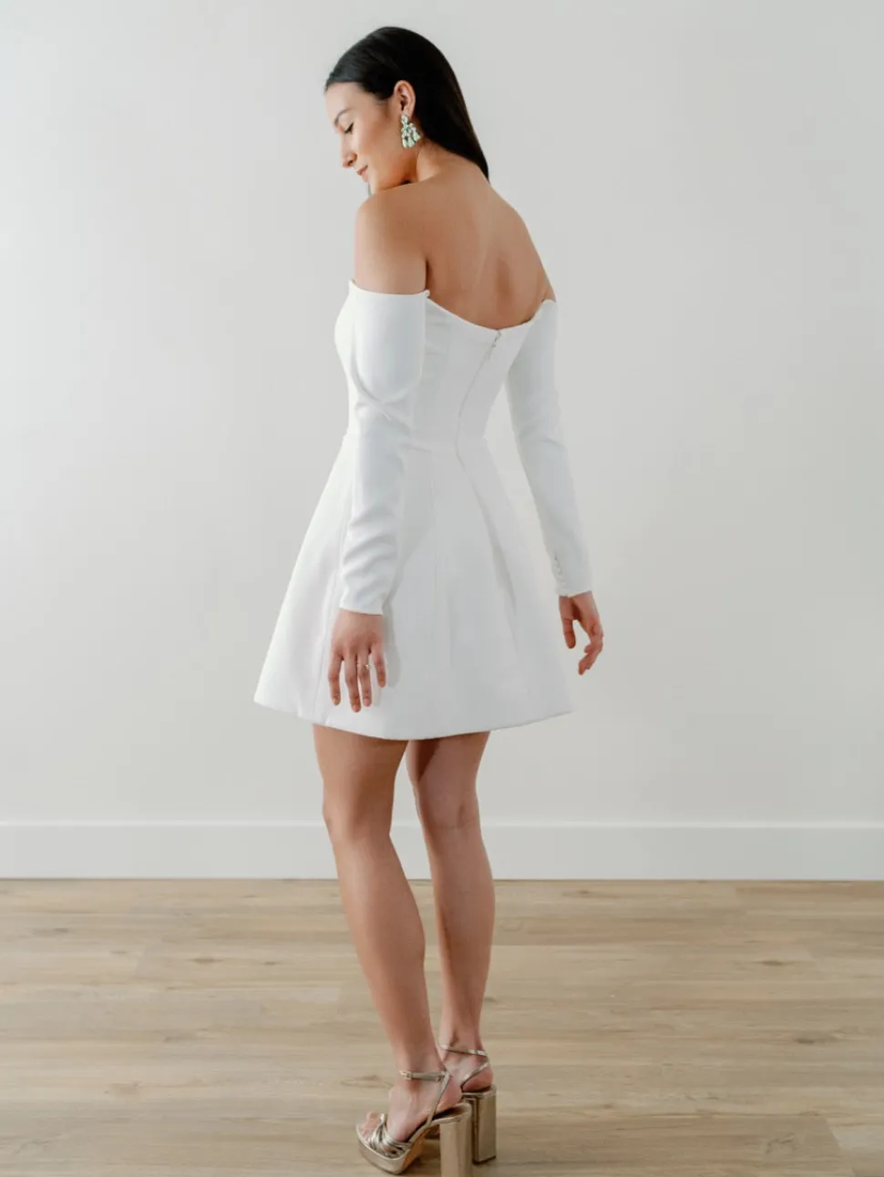 The magic in By Watters—a family-run business of designers, seamstresses, and pattern makers—is understanding how the wants and needs of brides evolve. Embracing drama, versatility, and individuality, By Watters makes dresses for the brides and bridesmaids you want to be. A timeless A-line silhouette meets off-the-shoulder sleeves and a mini length skirt in this instant classic, made modern.
