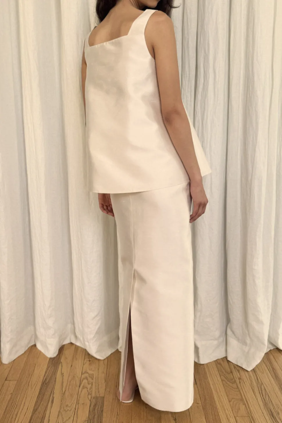 After honing her design vision and couture experience at Zac Posen, Narciso Rodriguez, and Chanel, Meredith Stoecklein emerges on her own with LEIN. The brand offers a new concept of tasteful, stylish wedding wear for the thoroughly modern bride. The Chloe Tank in Silk Mikao Shantung is an elegant, long trapeze tank with a high square neckline.