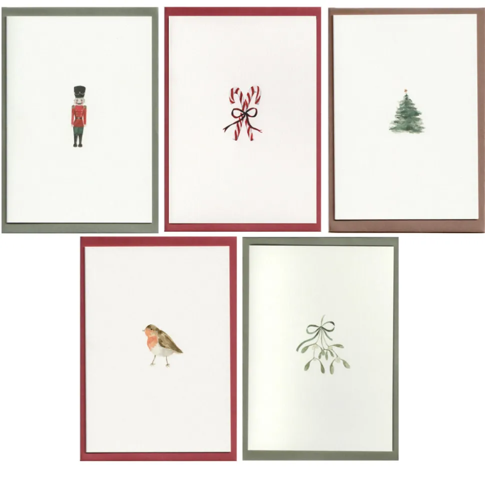A lifelong love of the written word led Alice Edwards to create Memo Press, a luxury stationery company specializing in small batch cards, paper gifts, and writing paper that make any expression, or occasion, that much more meaningful. Celebrate the season with a pack of five greetings cards and envelopes, boasting each of the brand’s Christmas watercolor illustrations: a robin redbreast, a Christmas tree, a pair of candy canes, a sprig of mistletoe, and a nutcracker soldier. Blank inside, each arrives with a colored envelope.
