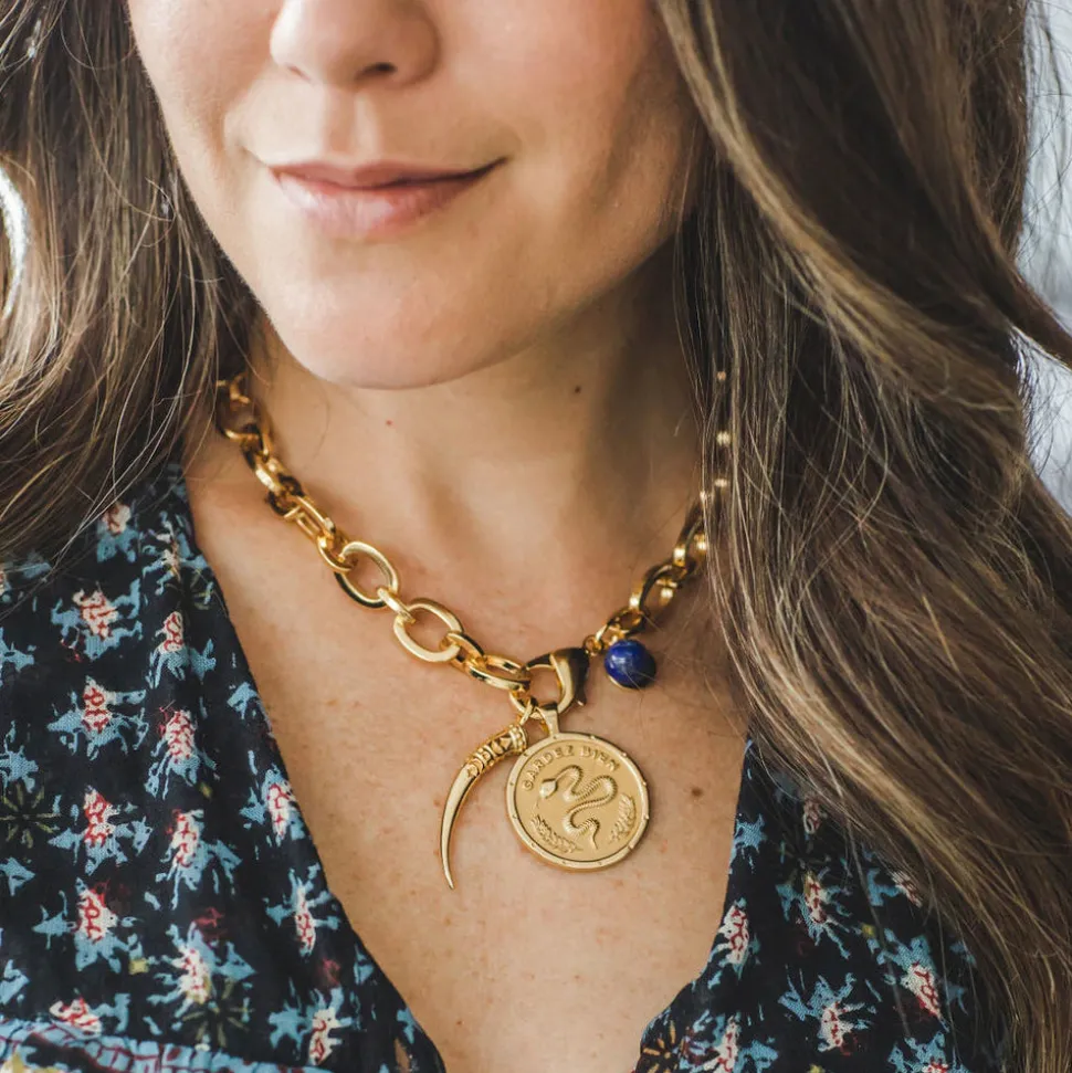 Jane Win’s collection of eight amulets symbolize abundance of positivity, strength, hope and luck, and are shaped to resemble antique coin jewelry. An amazing gift to memorialize milestone moments, or just the perfect eye-catching accessory for a night out, these pieces are worth more than their weight in gold. The Chunky Link Chain with Lapis Bead is a choker style chain that sits high on the neck; looks gorgeous on its own, or with a pendant addition.